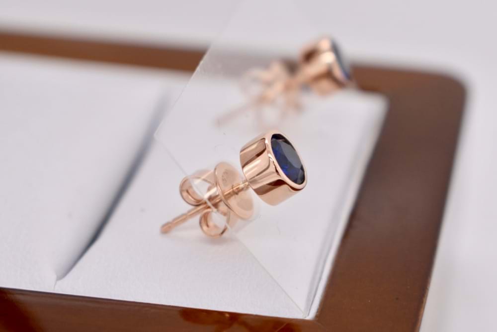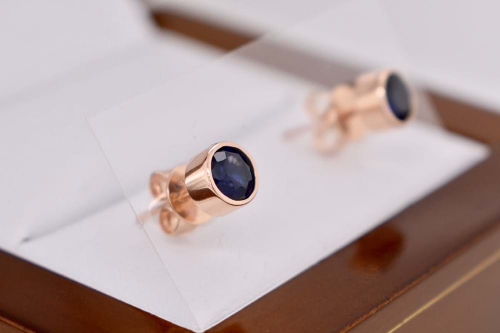 Handmade 9ct rose gold bezel set studs with high quality post and butterfly fittings set with 6mm round faceted dark blue Ceylon sapphires