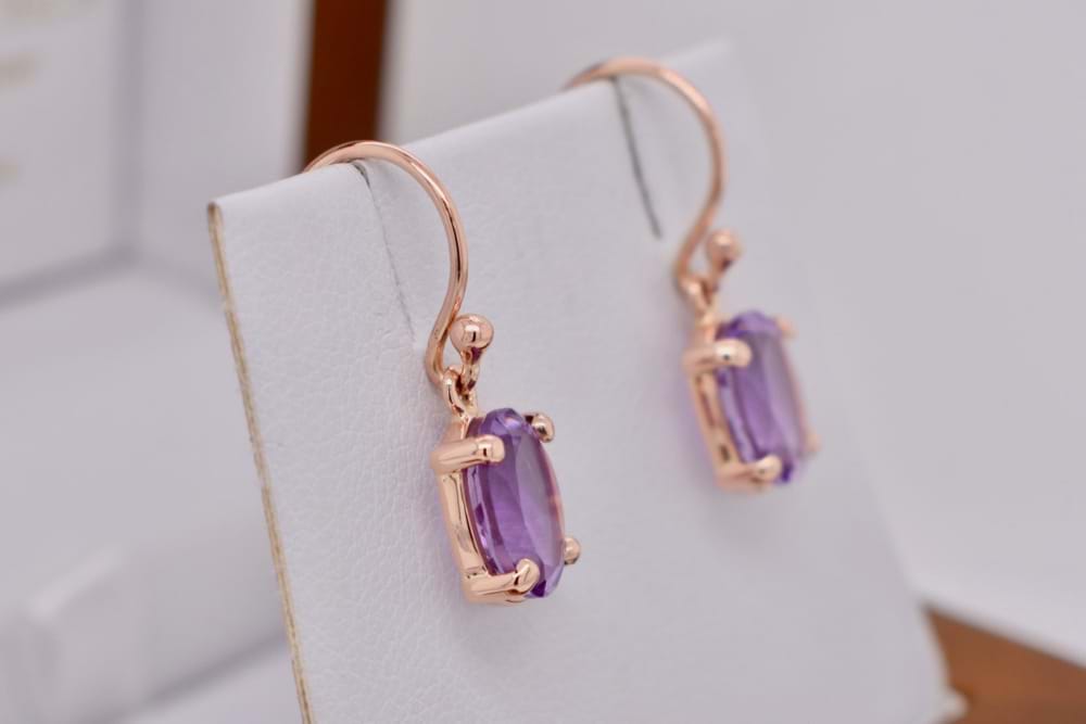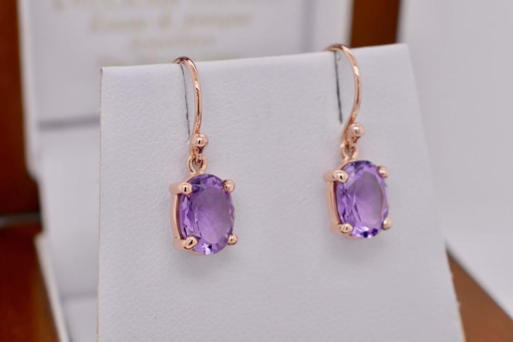 A beautiful purple/pink pair of oval faceted amethysts measuring approx 9x7mm set into handmade 9ct rose gold four claw settings suspended from shepherd hook fittings