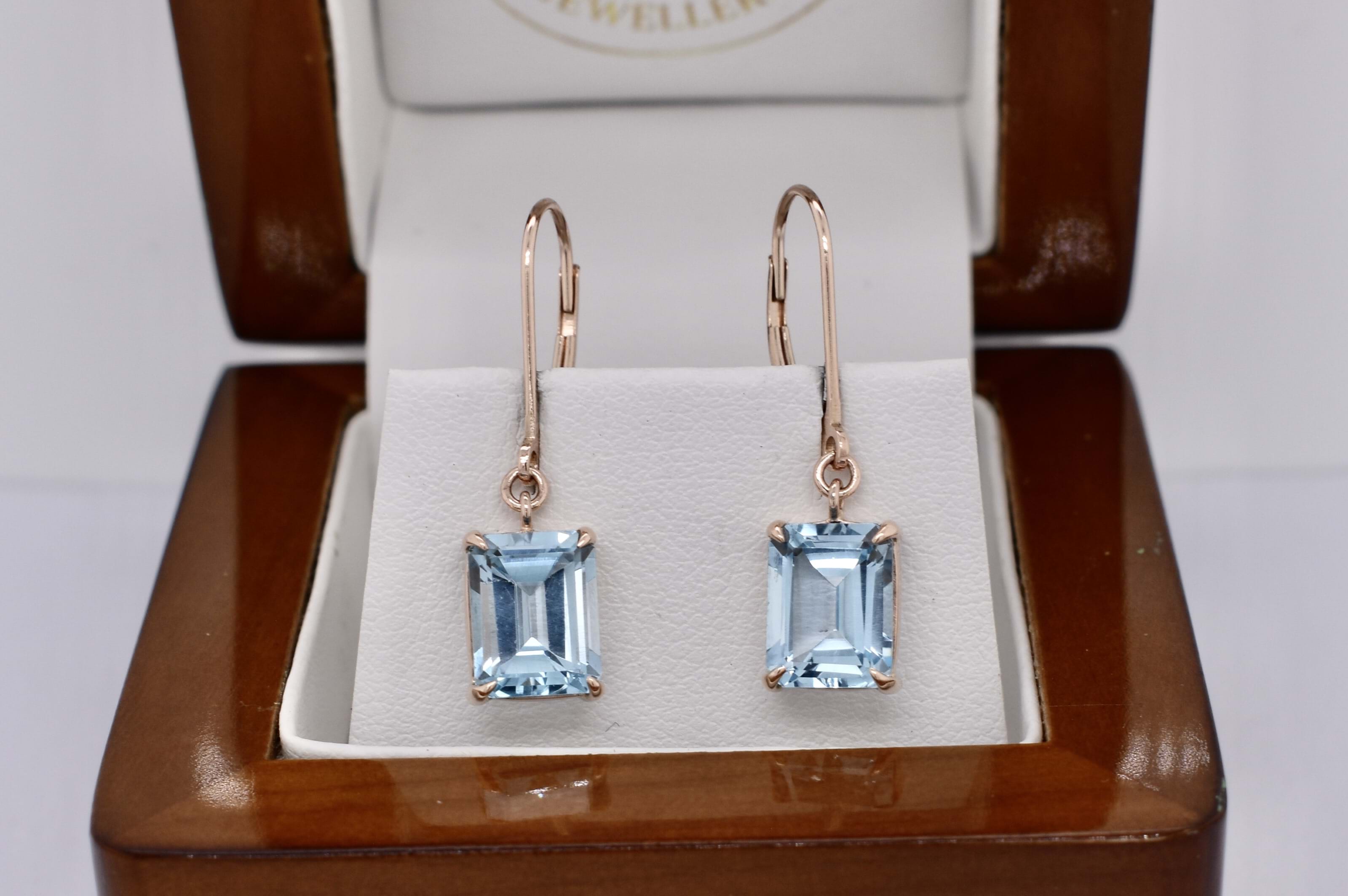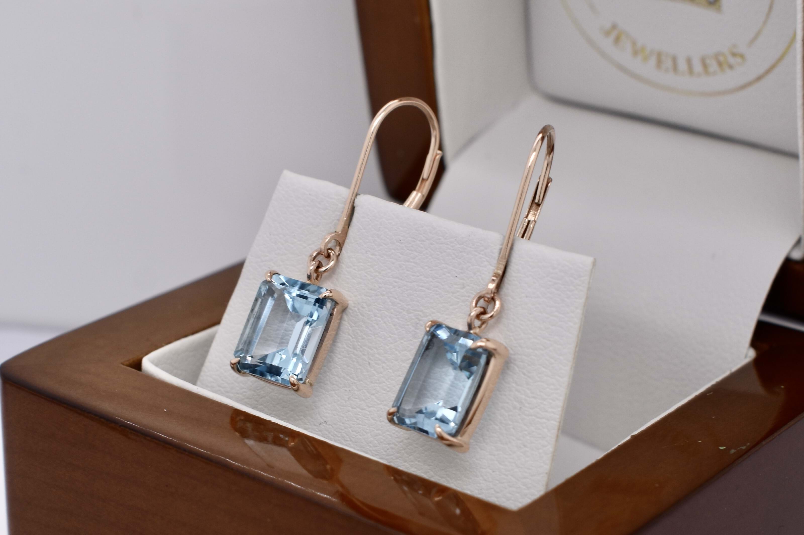 Beautiful and feminine sky blue topaz pair cut into emerald cuts measuring approx. 9.7x7.6mm set into handmade 9ct rose gold four claw settings and suspended from euroclip fittings