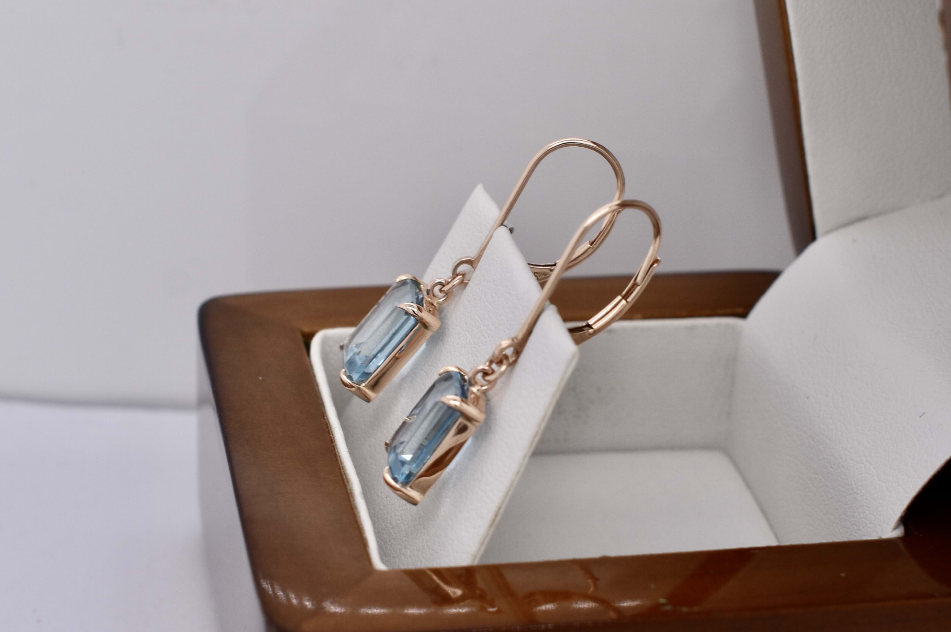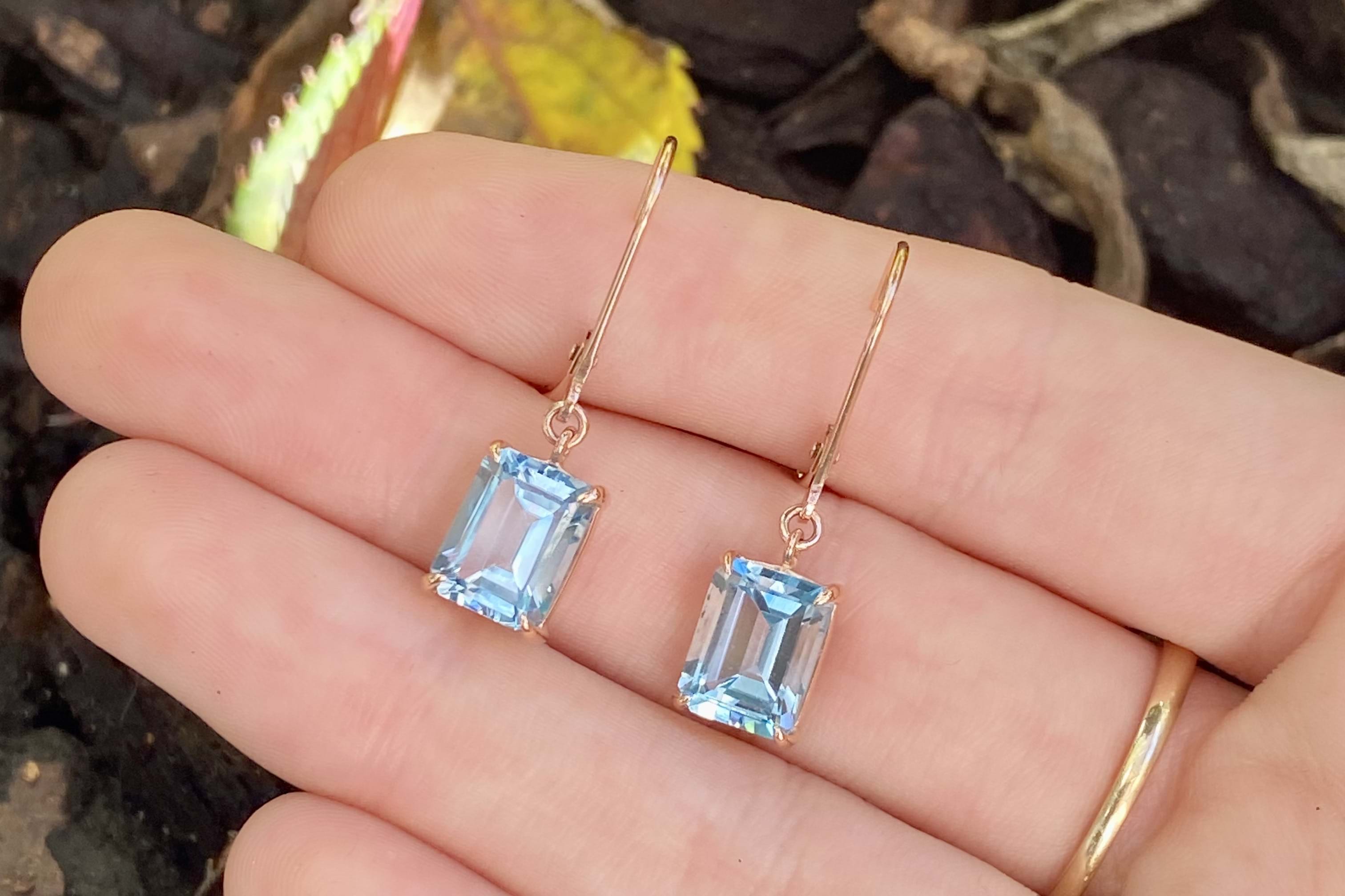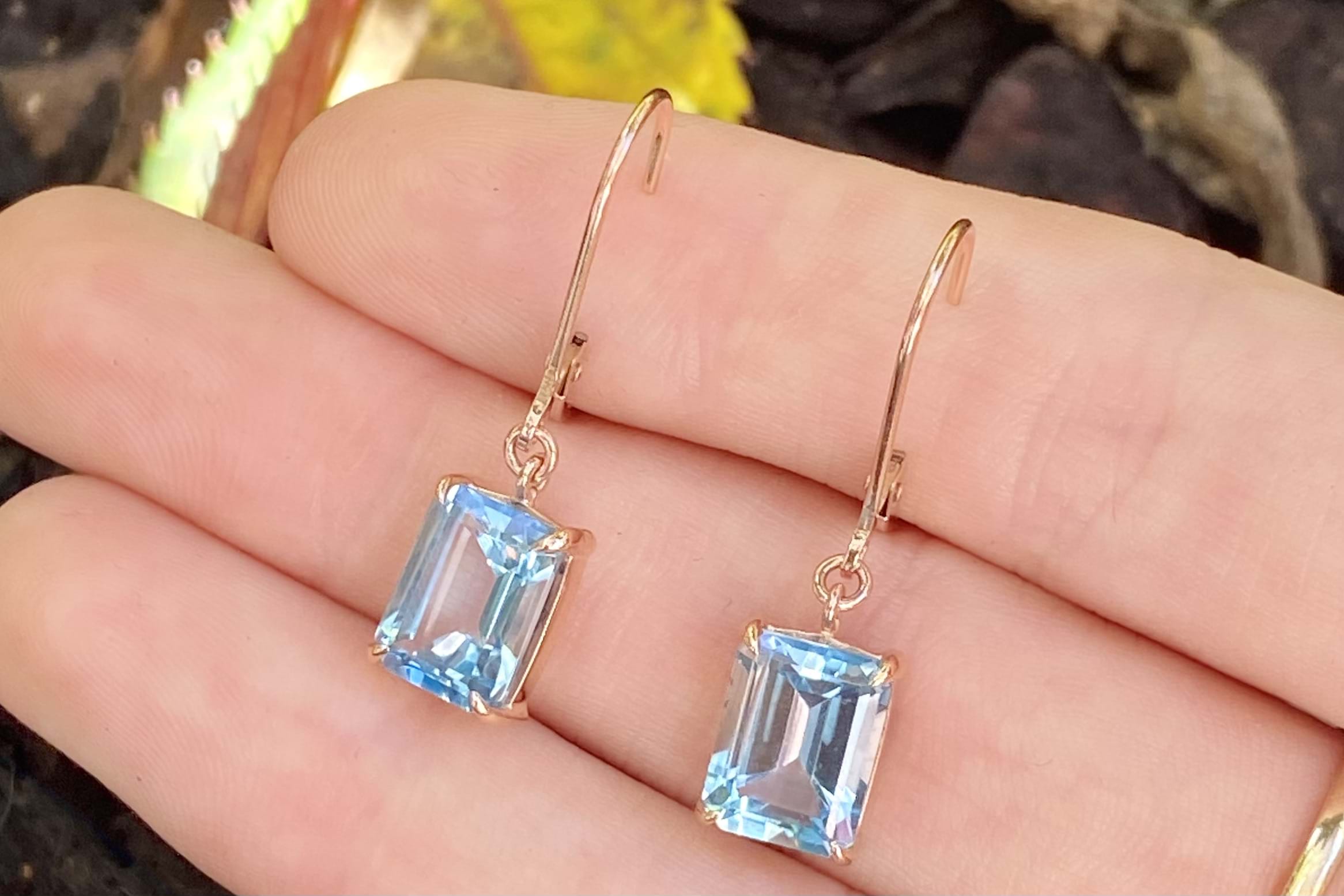 SOLD Handmade 9ct Rose Gold Emerald Cut Sky Blue Topaz Drops with Euroclip Fittings