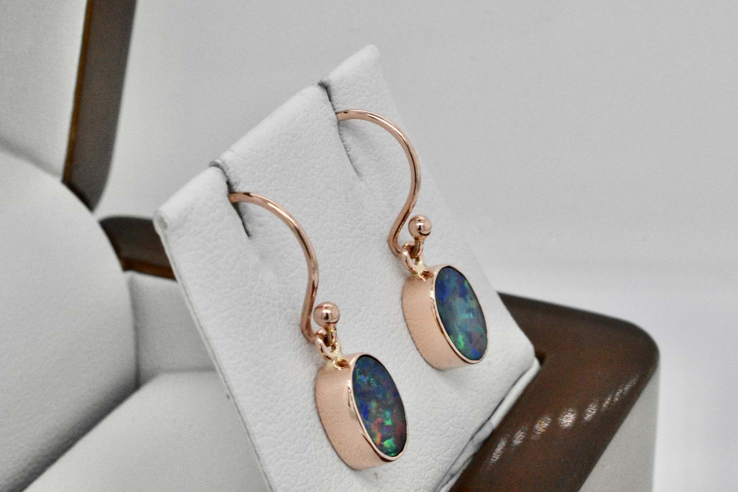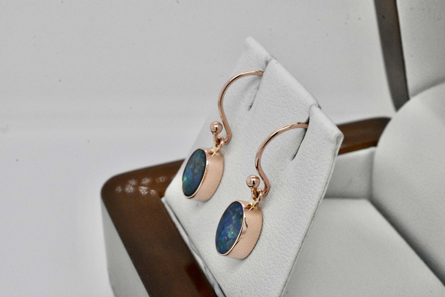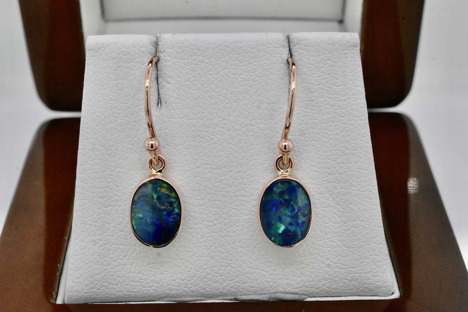 Handmade 9ct rose gold drop earrings featuring oval opal doublets measuring approx. 9 x7mm and displaying yellow, green and blue flashes, suspended from shepherd hook fittings. Our doublets consist of a Coober Pedy opal top and a boulder opal base
