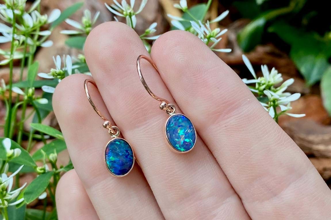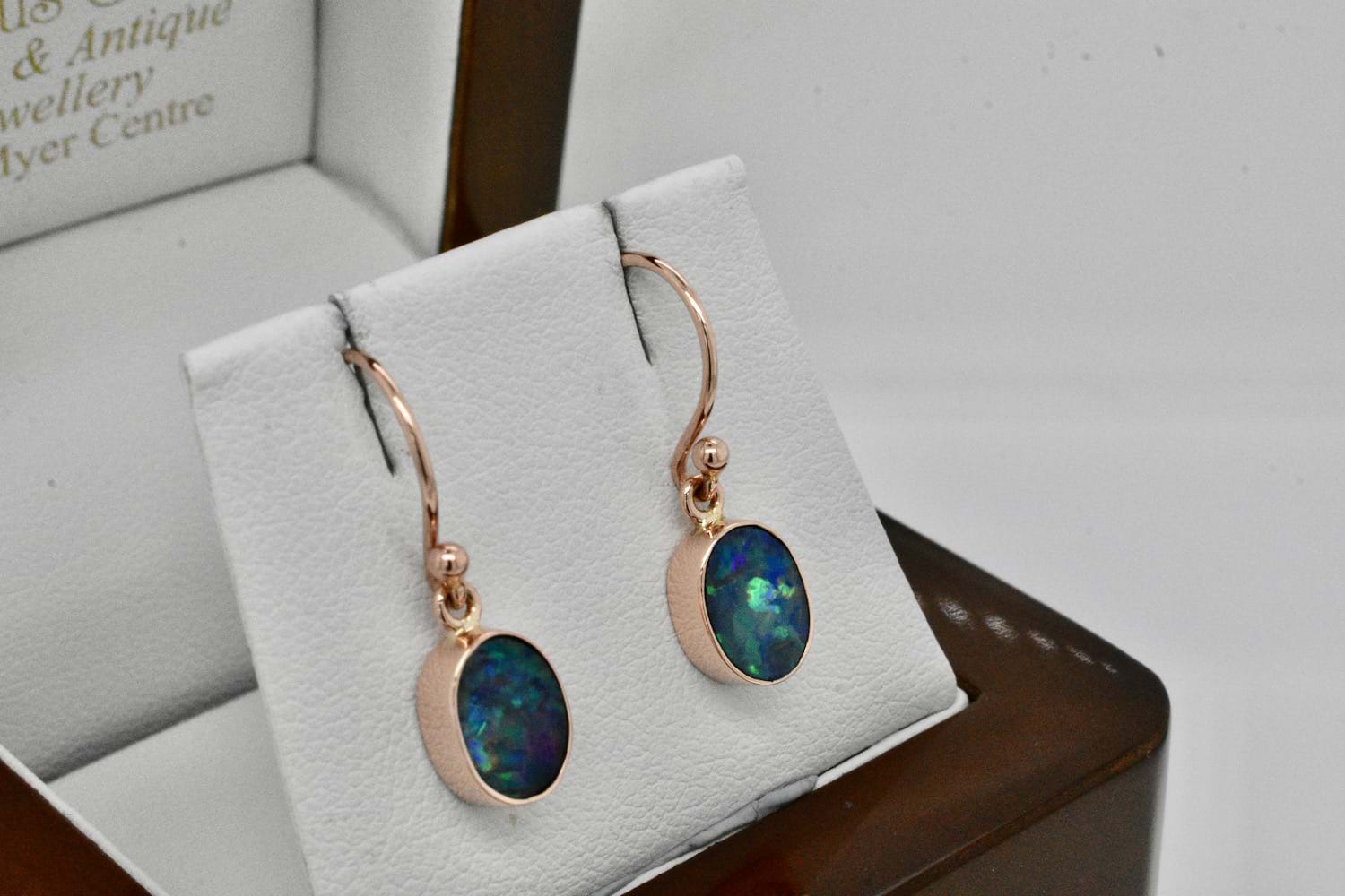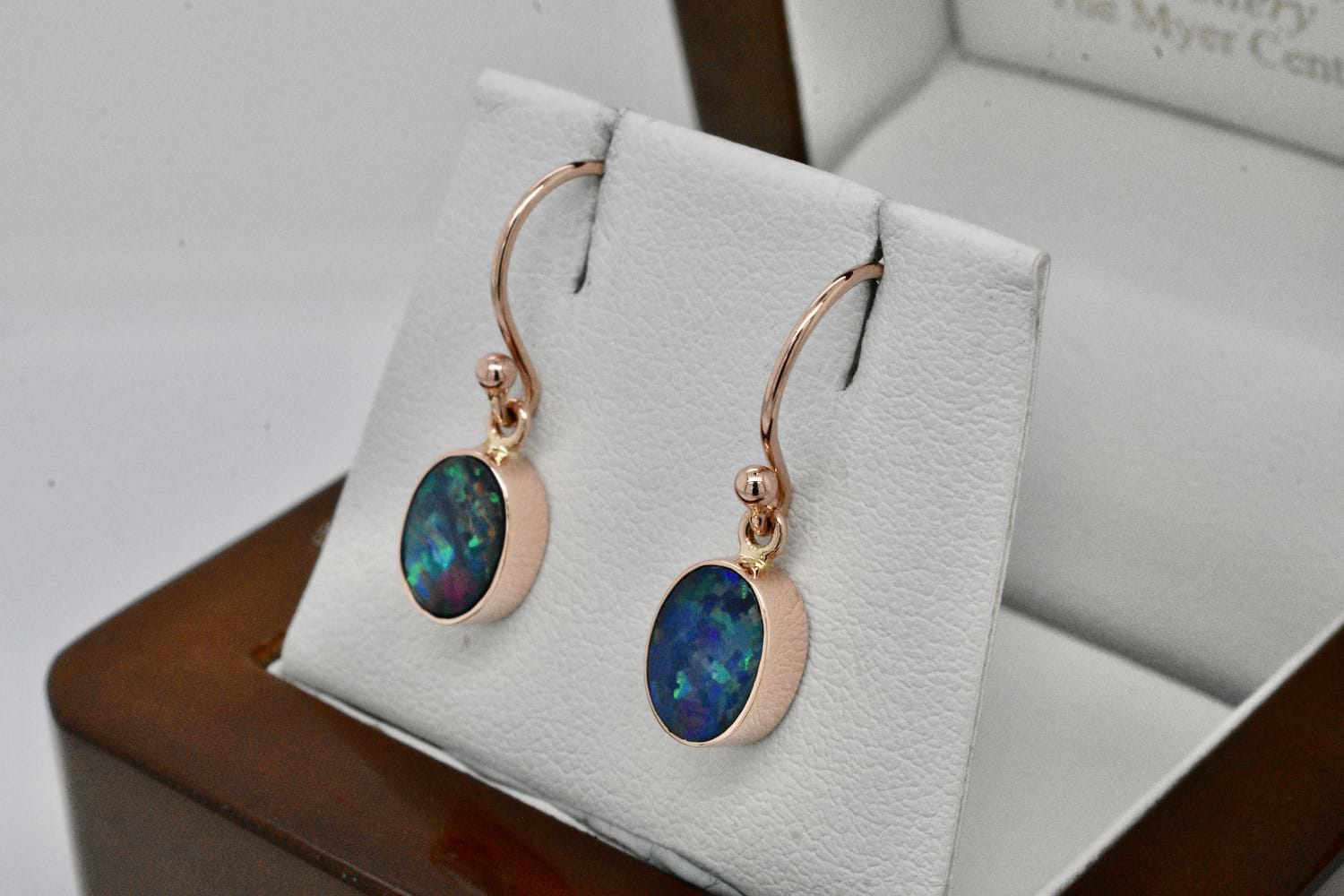 Handmade 9ct rose gold drop earrings featuring oval opal doublets measuring approx. 9 x7mm and displaying yellow, green and blue flashes, suspended from shepherd hook fittings. Our doublets consist of a Coober Pedy opal top and a boulder opal base