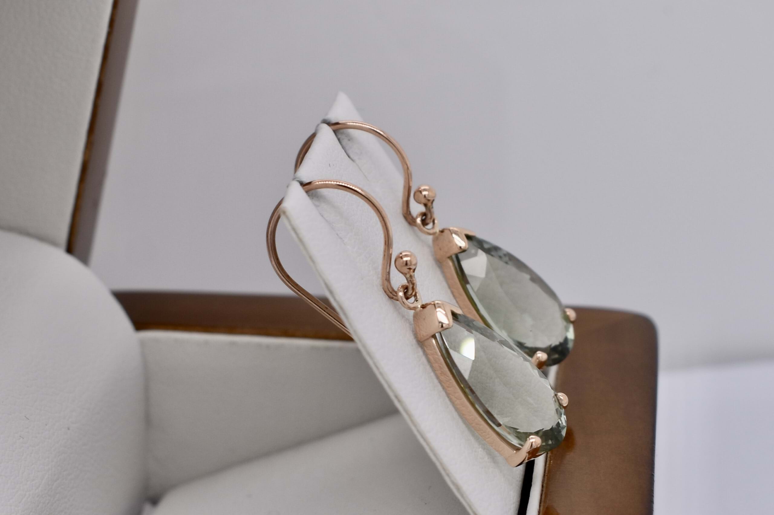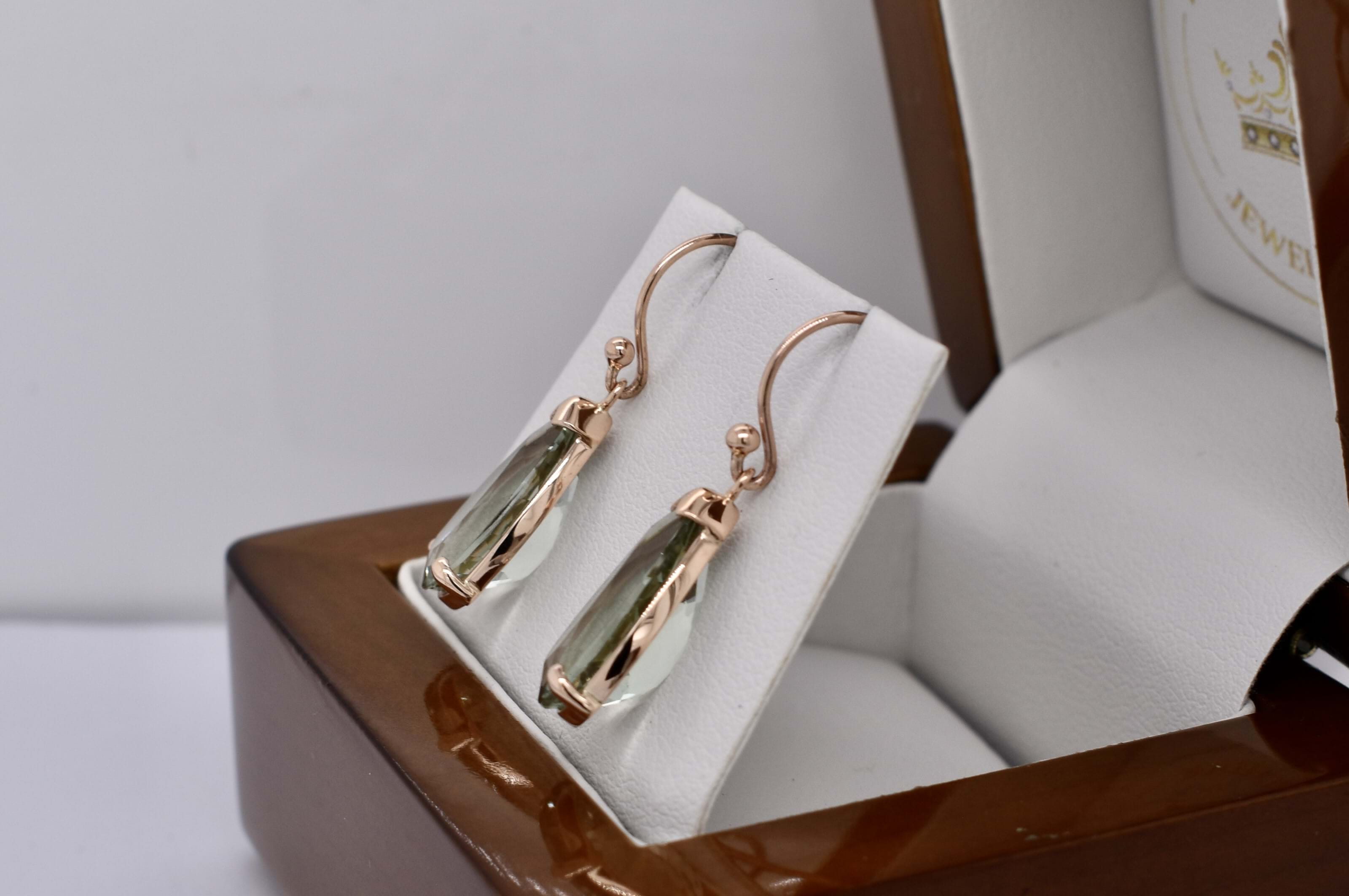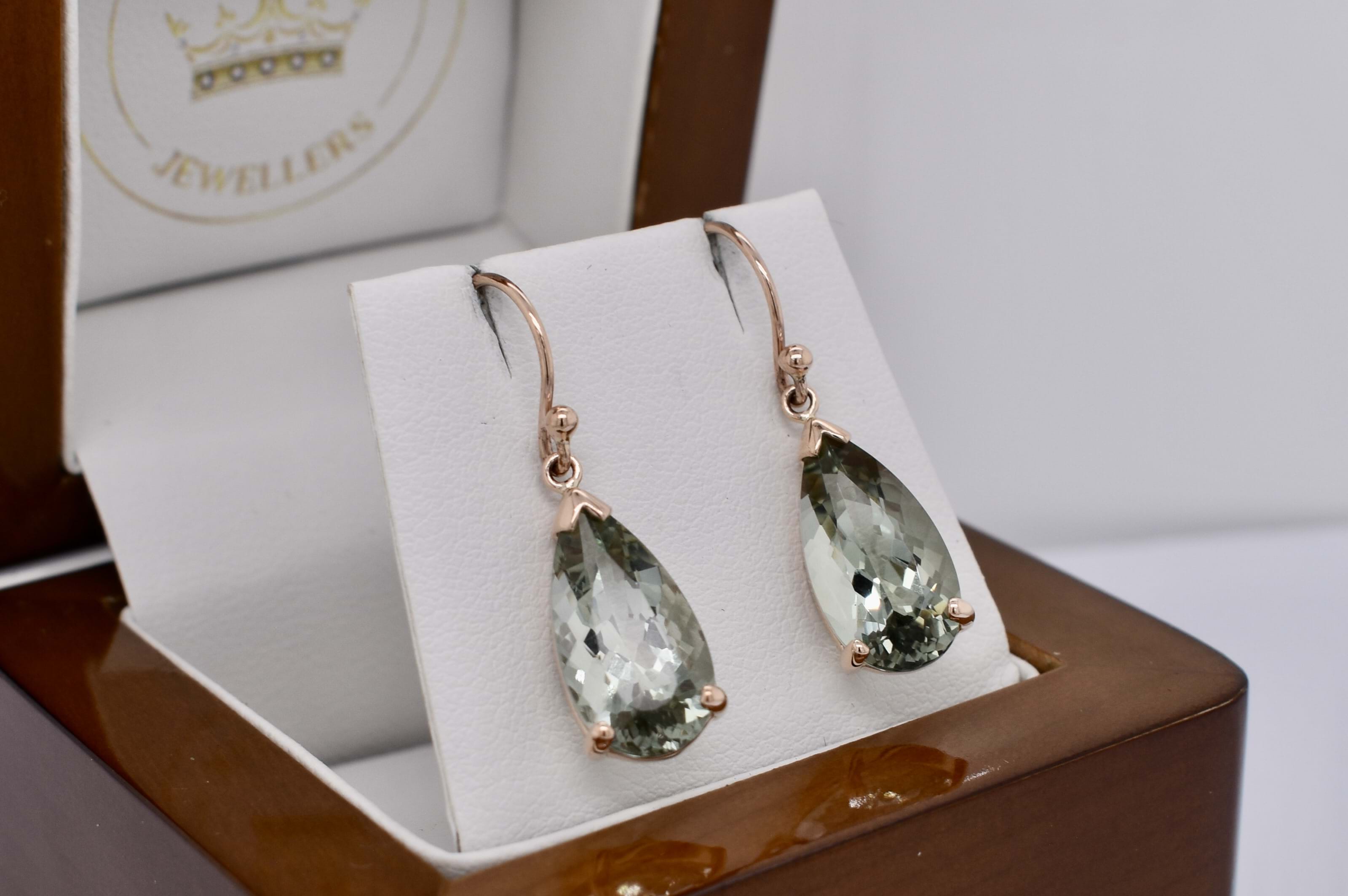 Beautiful large prasiolite pear shaped drops, measuring 15.9x8.3mm with checkerboard faceting. Two claw and cap set in 9ct rose gold. Completed with shepherd hook fittings.