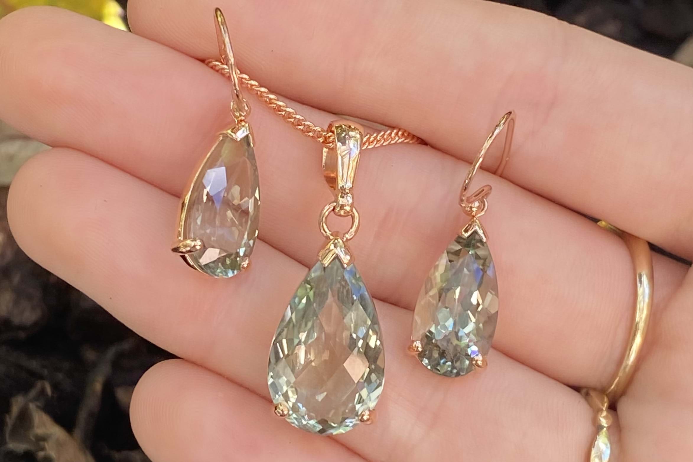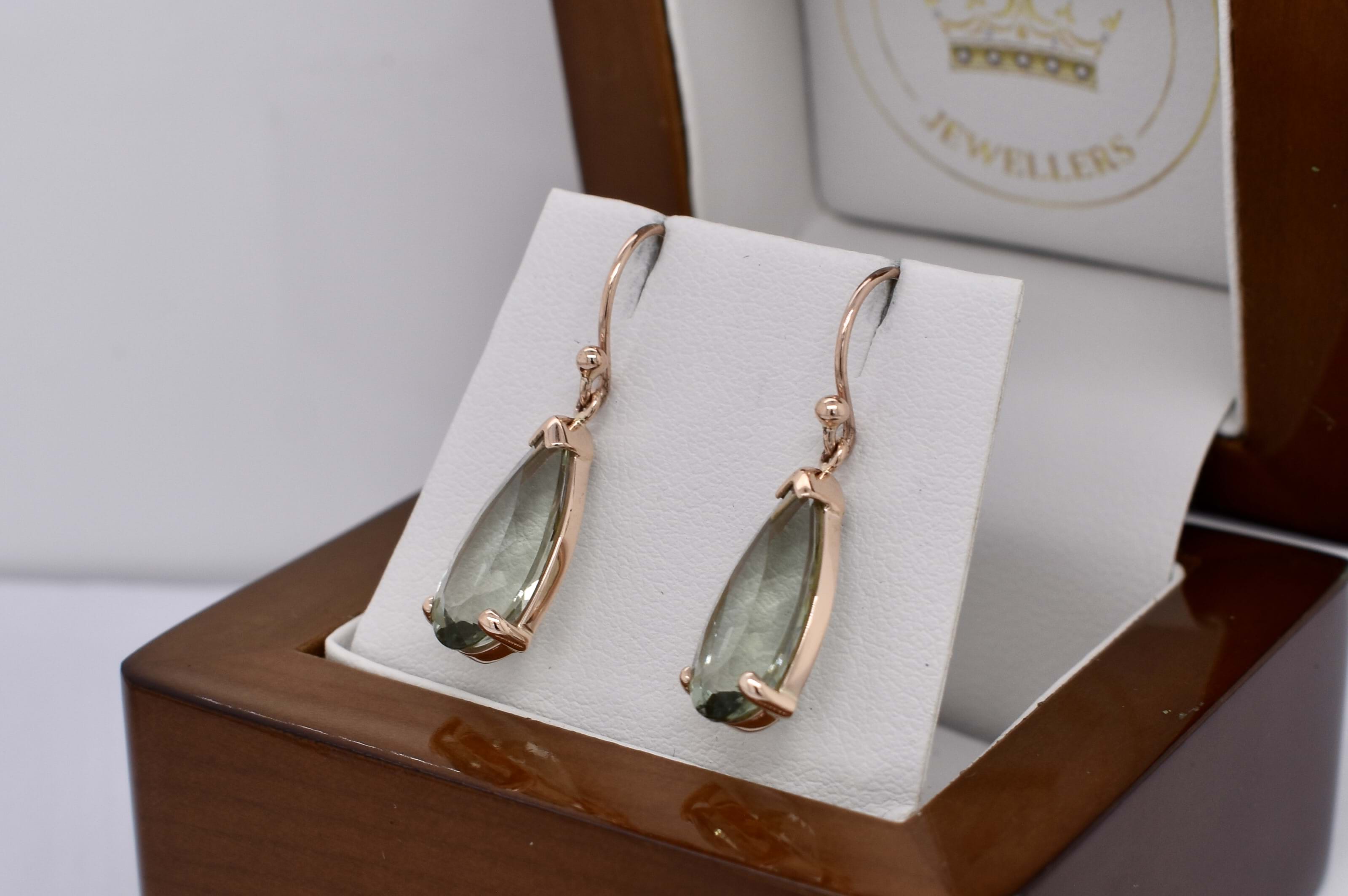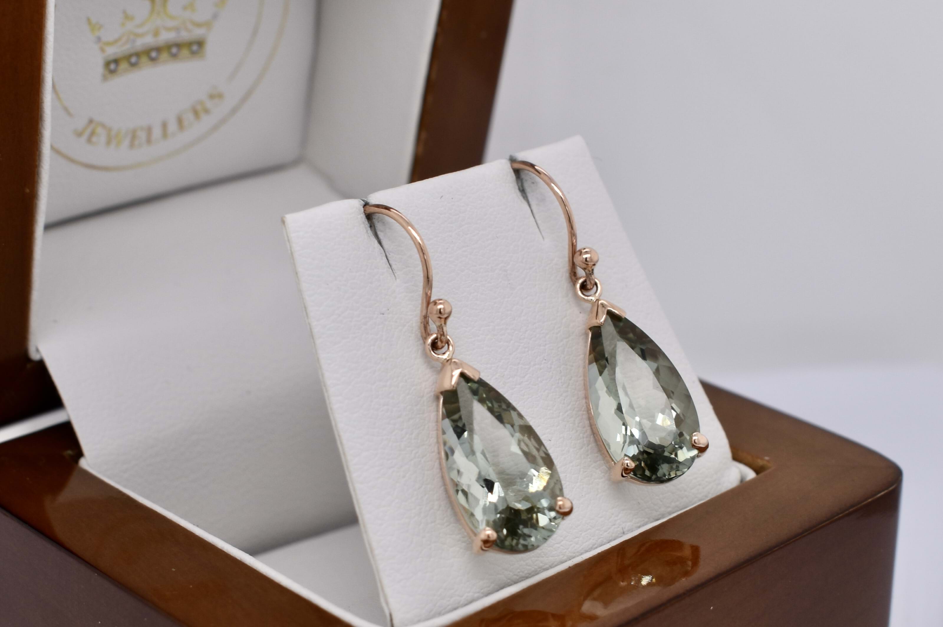 SOLD Handmade 9ct Rose Gold Pear Shaped Prasiolite 15.9x8.3mm Drops