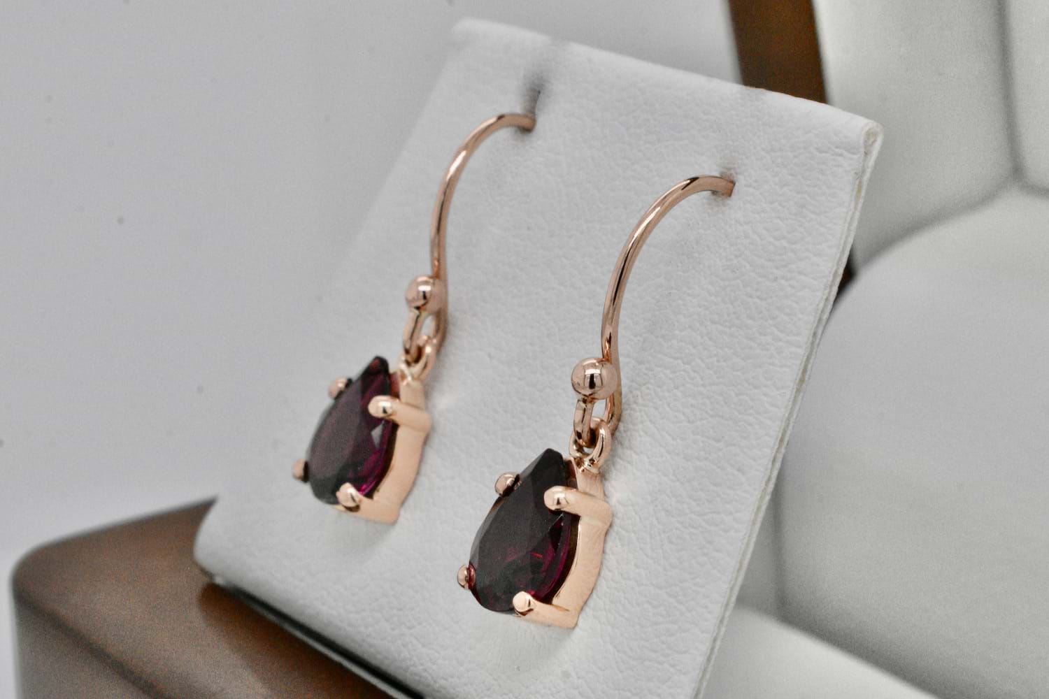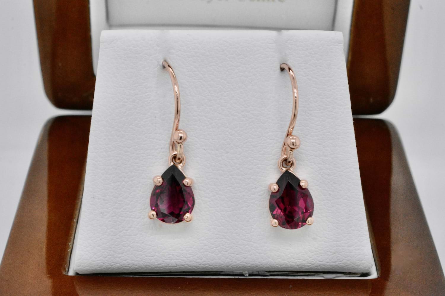 Beautiful handmade 9ct rose gold earrings featuring lovely pearshape Rhodolite garnet measuring approx. 8x6mm in four claw setting suspended from shepherd hook fittings