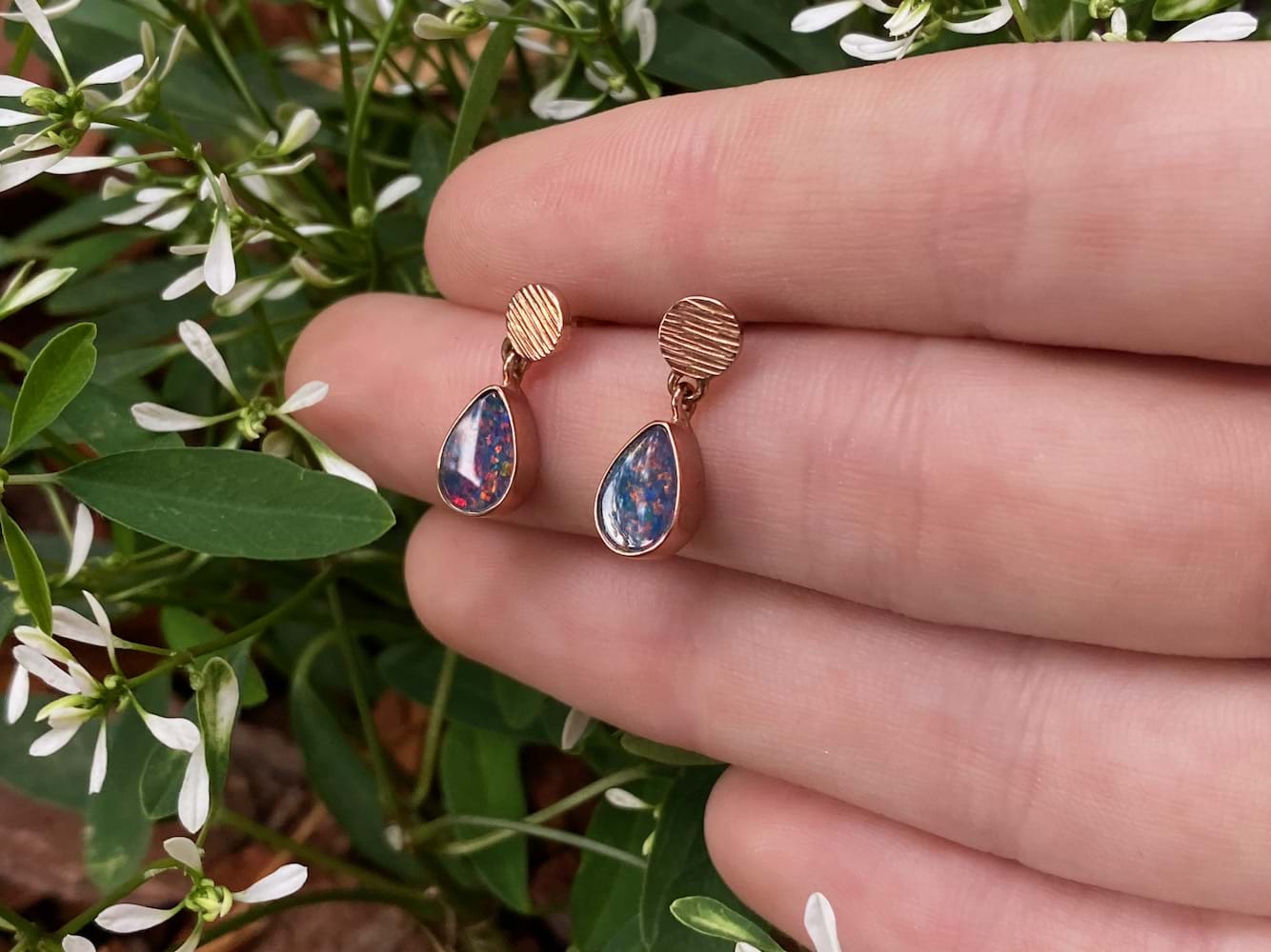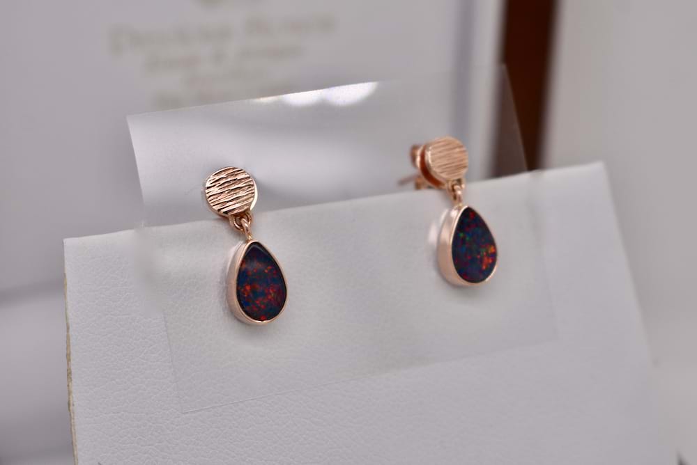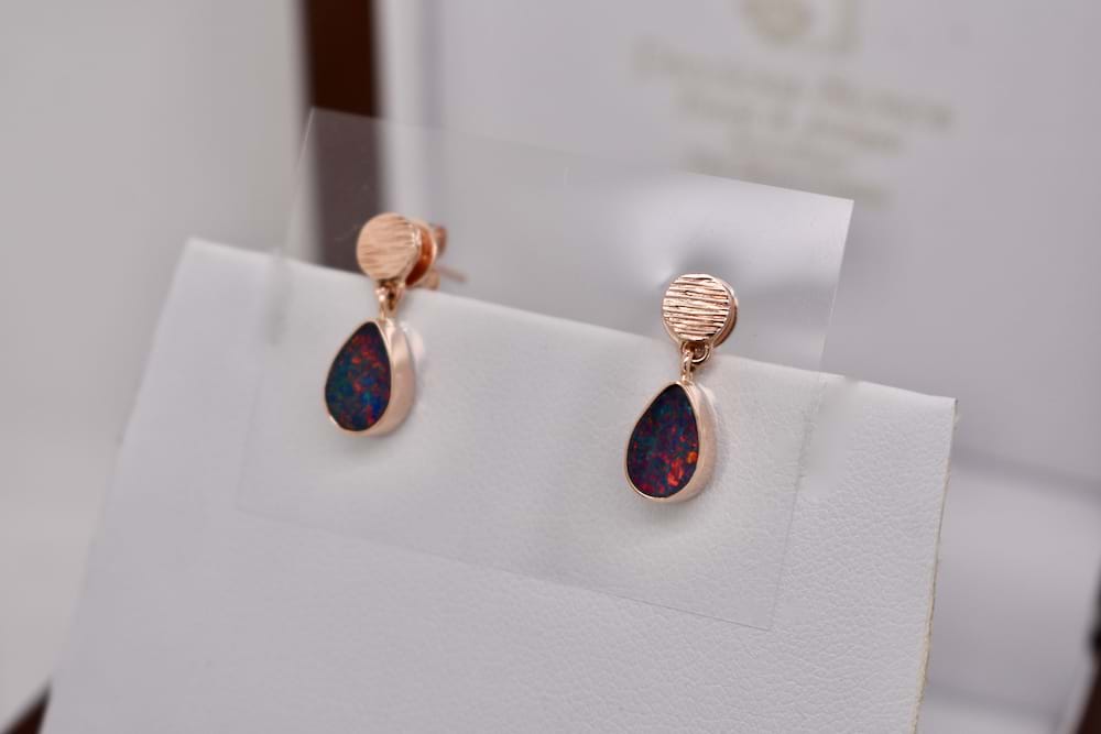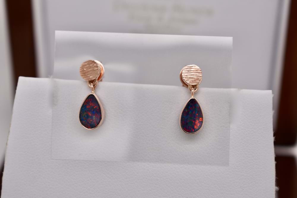 Handmade in 9ct rose gold, these gorgeous doublet opal drops have a boulder opal base and a Coober Pedy opal top with a dark body and red/blue flashes, measuring 8.7 x 6mm and suspended from textured studs