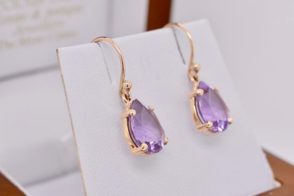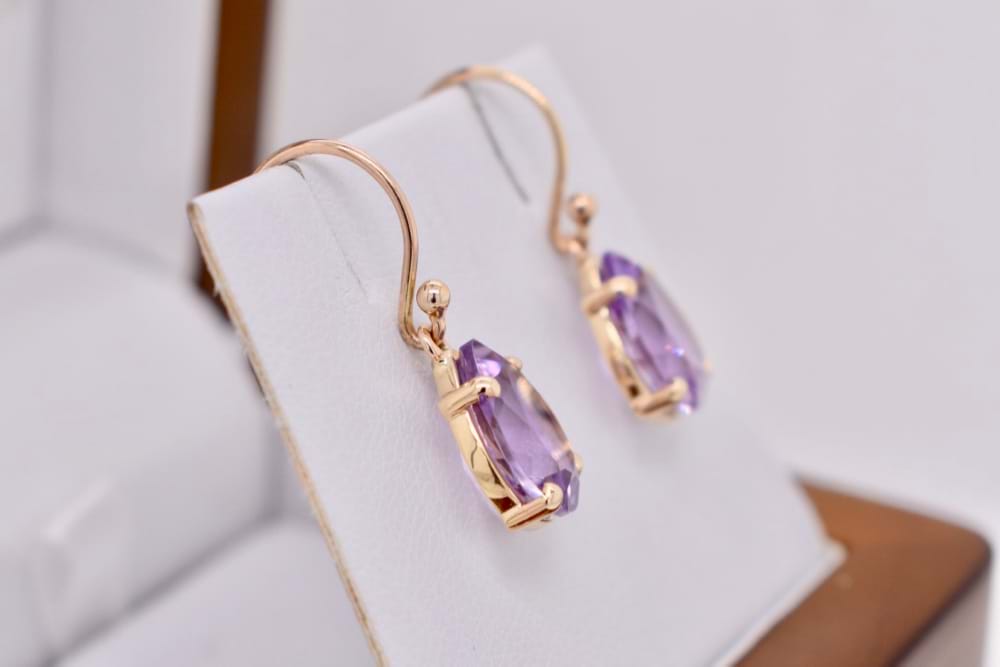 A feminine and pretty pair of pink/purple amethyst in a faceted teardrops measuring approx 11x9mm in handmade 9ct rose gold four claw settings suspended from shepherd hook fittings
