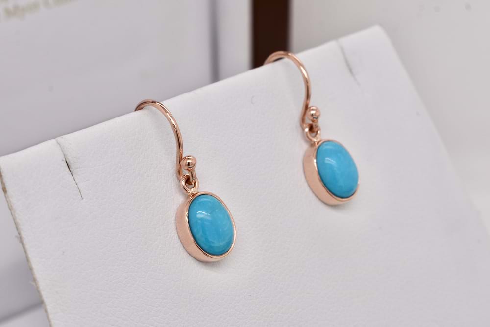 Lovely turquoise from Arizona in a cabochon oval shape bezel set in handmade 9ct rose gold settings and suspended from shepherd hook fittings