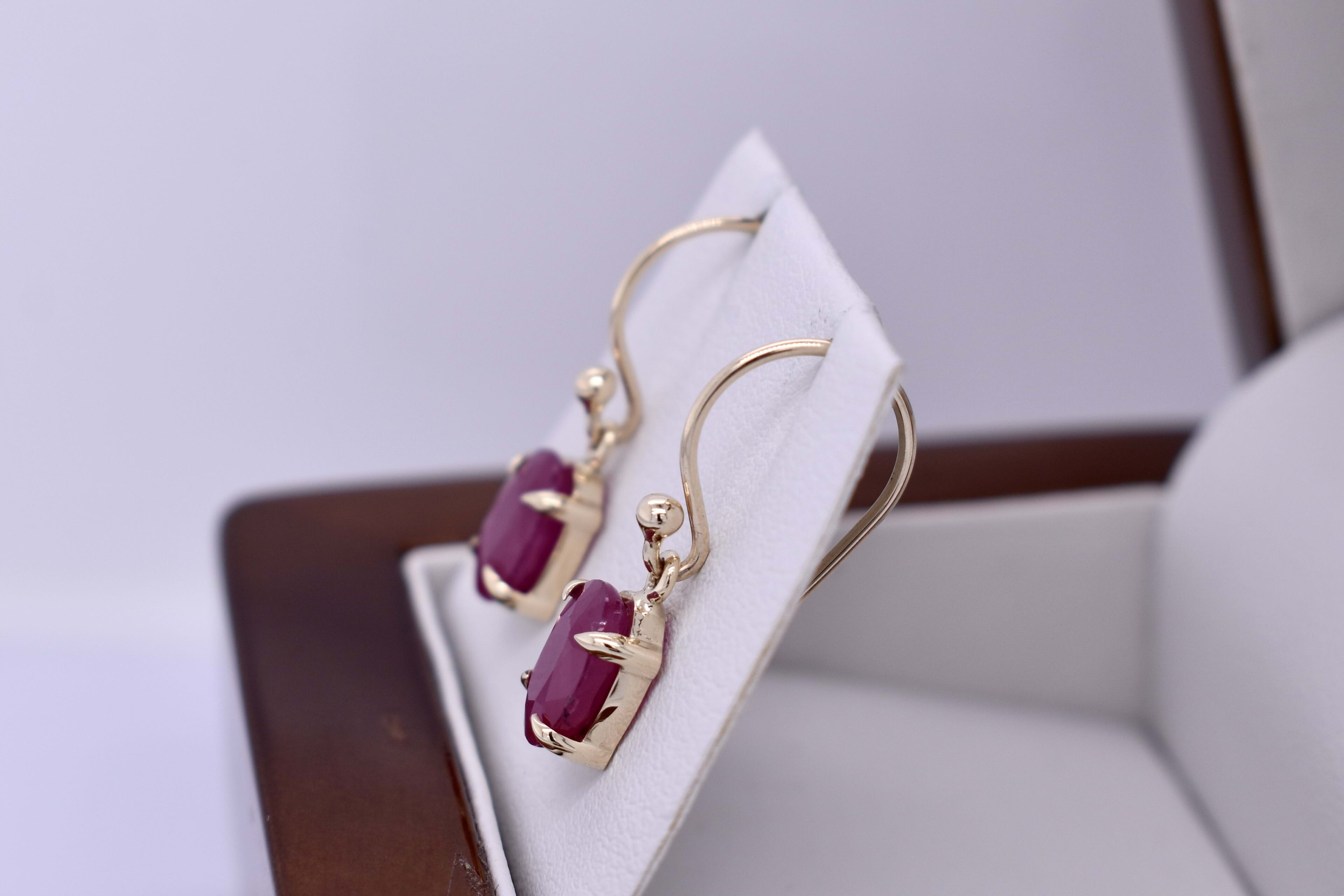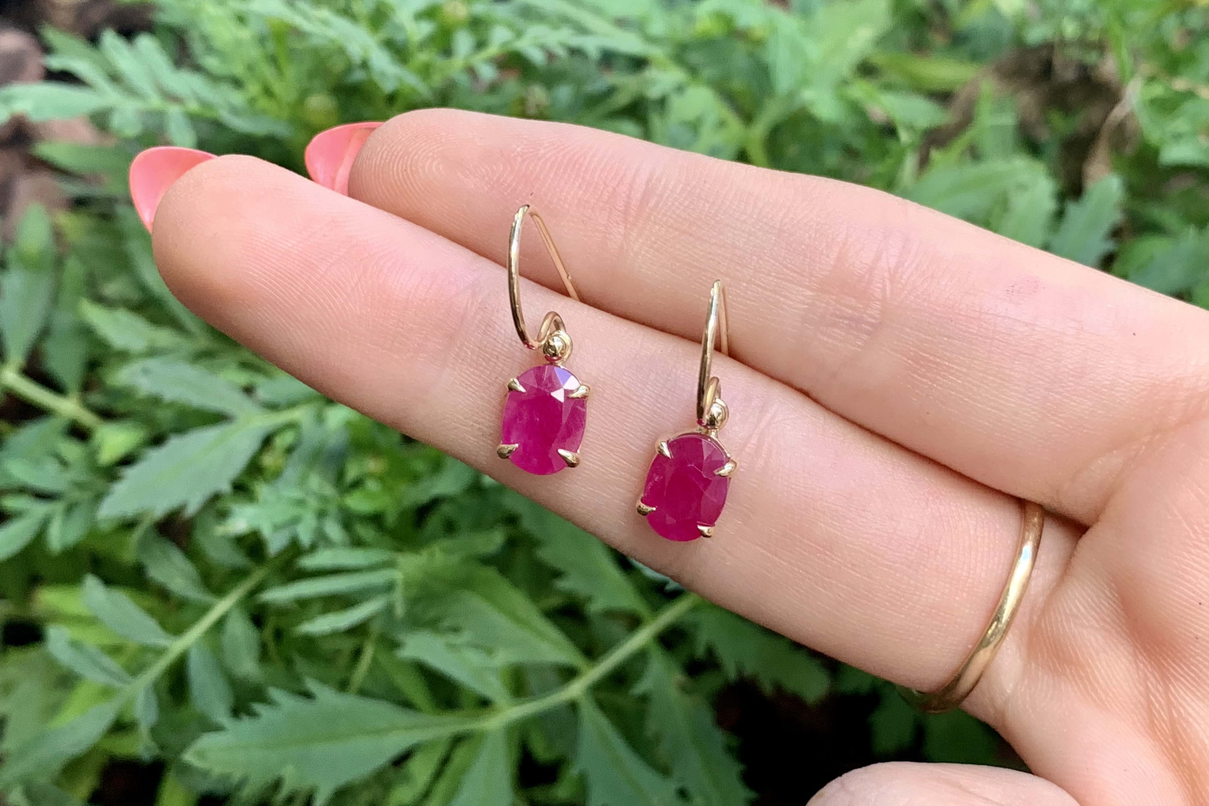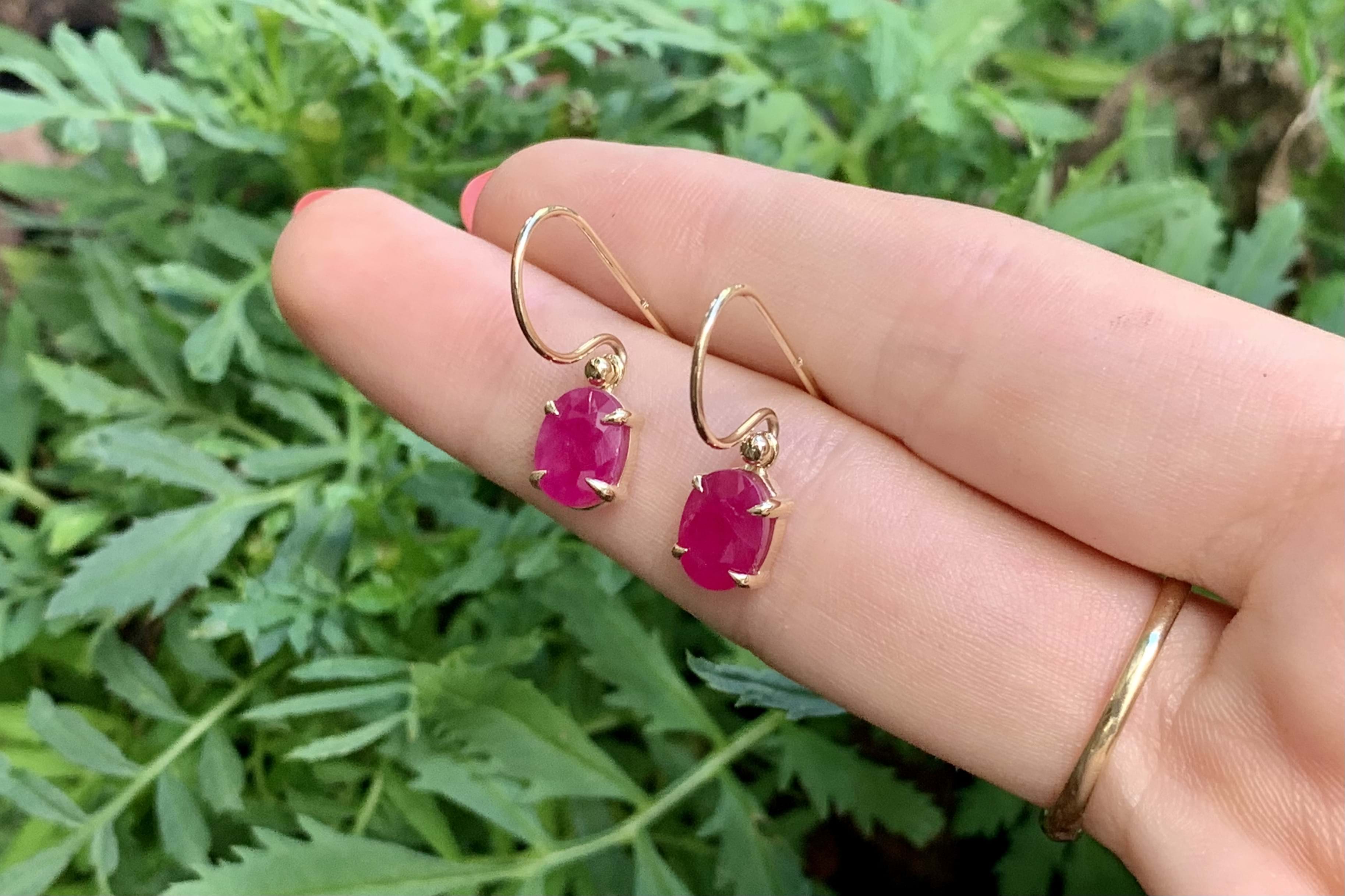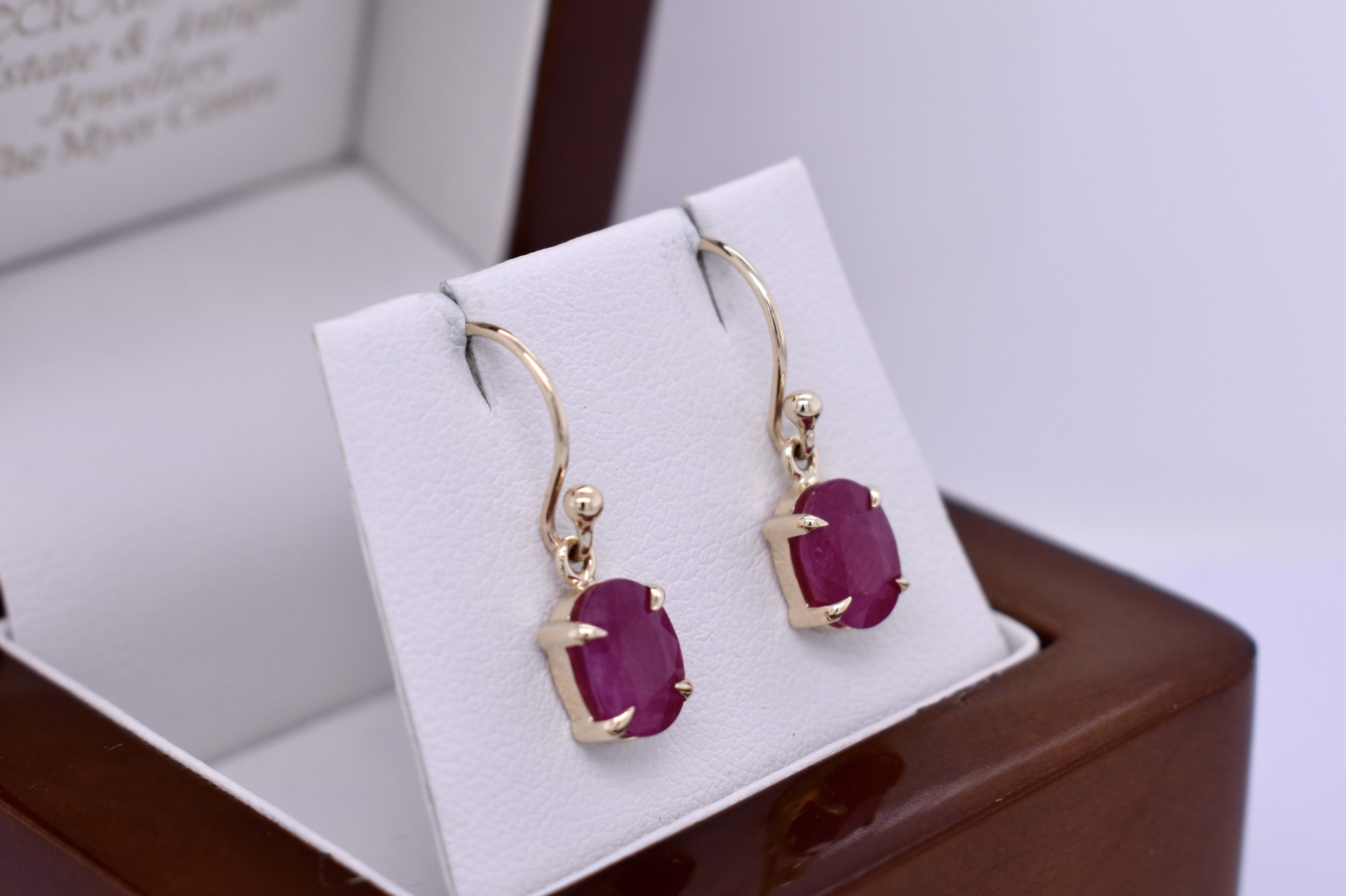 These sweet handmade oval ruby drops measure 8.05x6.45mm and are four claw set in 9ct yellow gold. Rubies are pinkish red and heated only. Finished with shepherd hook fittings.