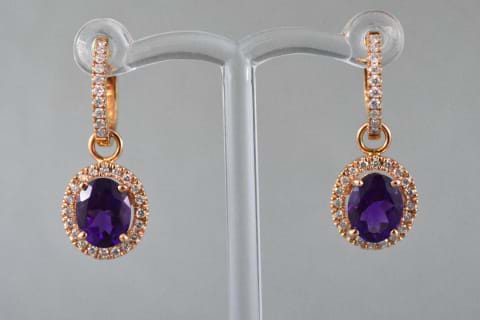 Stunning and striking. These simple and understated 18ct rose gold huggies feature 10 round brilliant cut diamonds, cut down claw set, in each earring and have been paired with a stunning set of 9ct rose gold halo drops with a vibrant oval amethyst and halo of 20 diamonds in each. With a total combined diamond content of 0.55cts, these versitile earrings can be worn everyday as simple diamond huggies, and dressed up for occasions by adding the halo drops. Independent Valuation Supplied