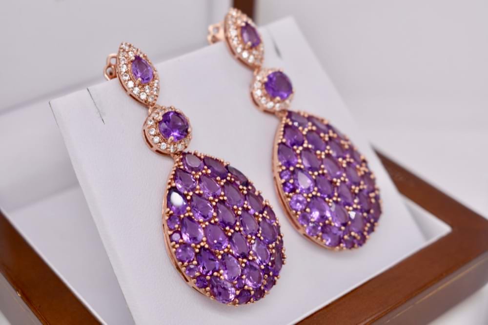 Set in sterling silver and finished in a rose gold plating are these stunning Amethyst and white Sapphire drop earrings. There is a total of 76 mid purple Amethyst and 64 colourless / white Sapphires in these beautiful earrings. Independent valuation supplied