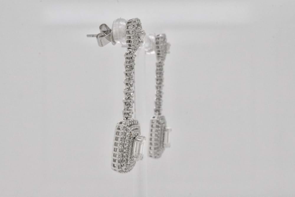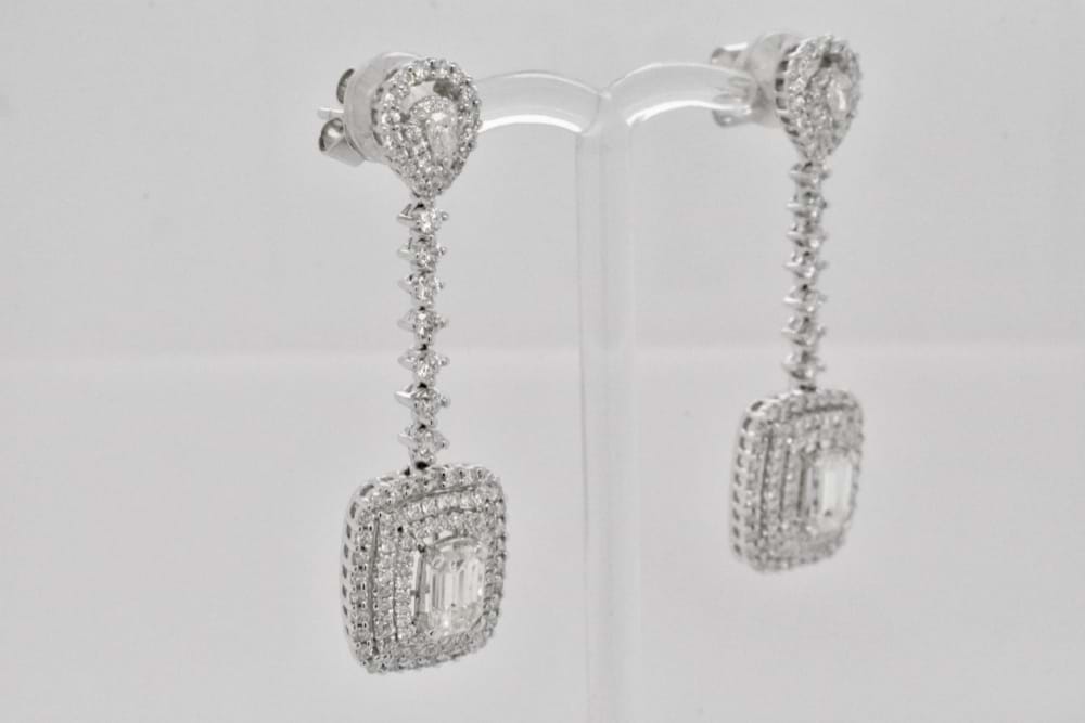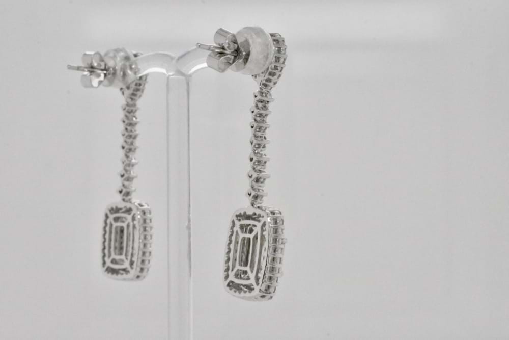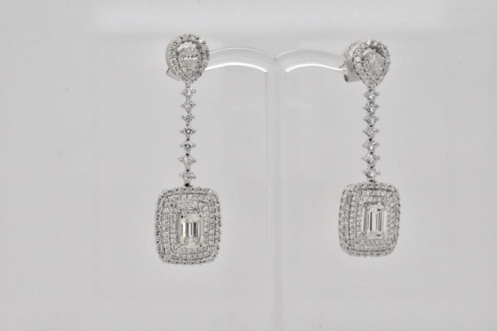 Absolutely breathtaking! These incredible earring pendants each contains a central 0.67ct emerald cut diamond surrounded by three halos of shimmering round brilliant cut diamonds- this feature is suspended from seven round brilliant cuts individually claw set in a vertical drop and a sparkling 0.07ct pear shape diamond stud which is also hugged by two halos of round diamonds. Crafted in 18ct white gold these timeless and beautiful earrings have a total diamond content of 3.04cts. Perfect wedding, or event earrings. Independent Valuation Supplied