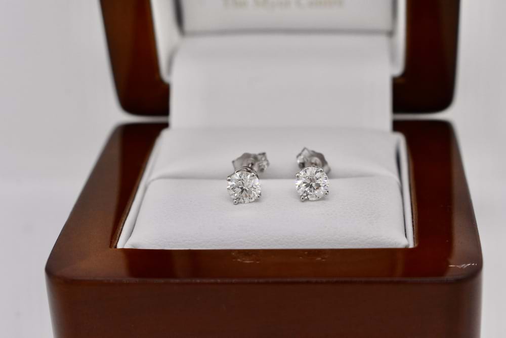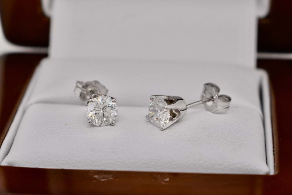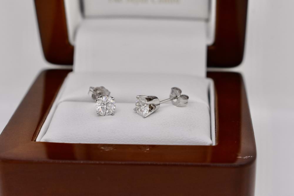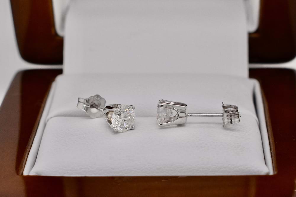 Two sparkling round brilliant cut diamonds four claw set into 14ct white gold stud fittings with post and butterfly fittings. Total diamond content equals 1.00cts, H colour, P1 clarity. Independent Valuation Supplied
