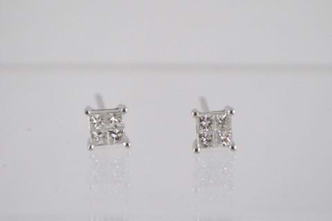 Crafted in 18ct white gold each stud earring features four glistening princess cut diamonds set into an illusion to give the impression of a single larger diamond. Total combined diamond content equals 0.35cts. Independent Valuation Supplied