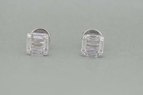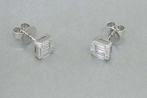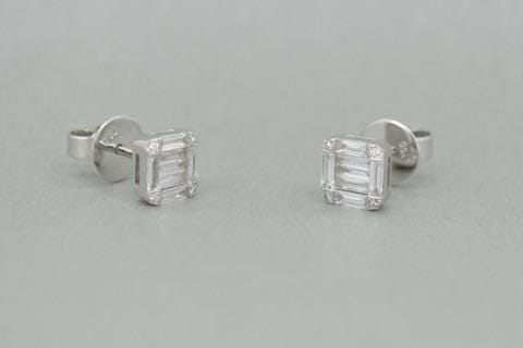 Amazing illusion! Designed to look like large emerald cut diamond studs these earrings contain a combinted total of eight round brilliant cuts and 14 baguette cut diamonds in 18ct white gold. With a total diamond content of 0.56cts you need to see them to believe how amazing they look! Independent Valuation Supplied