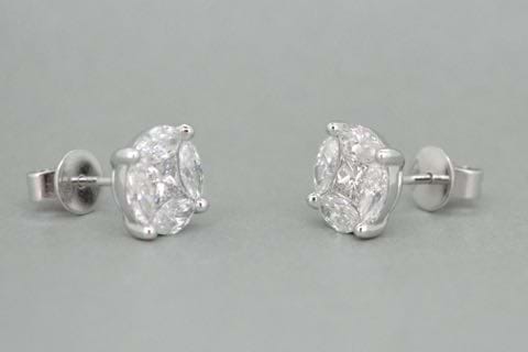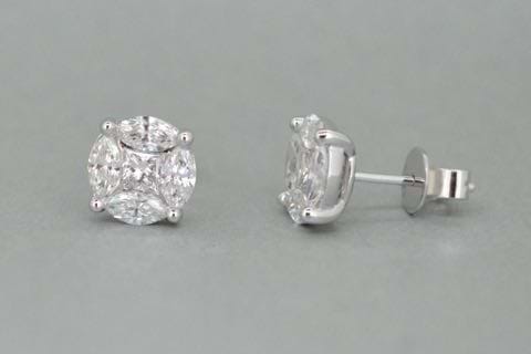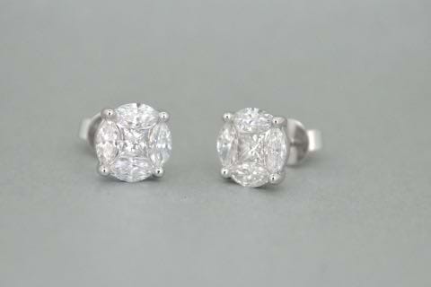 Incredible illusion! 18ct white gold studs each containing four marquise diamonds surrounded a princess cut diamond to imitate one large round brilliant cut diamond. Total combined diamond weight equals 1.79cts. Independent Valuation Supplied