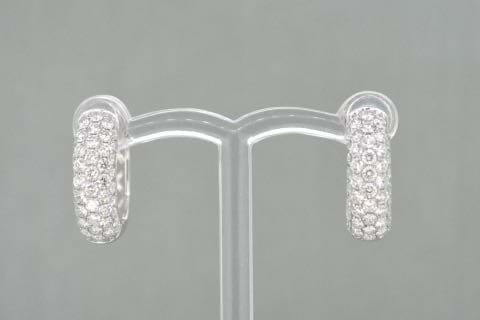 Stunning! These gorgeous diamond dome huggies are 5.5mm wide with a front that is entirely encrusted in rows of glistening round brilliant cut diamonds. Crafted in 18ct white gold, these exceptionally made huggies have a pretty filigree backing and contain a combined total of 92 diamonds equaling 1.81cts