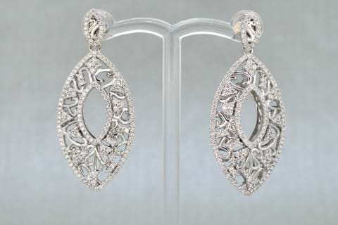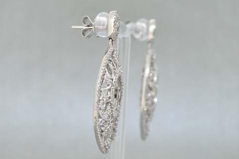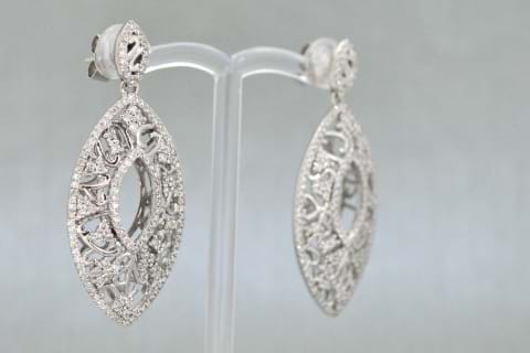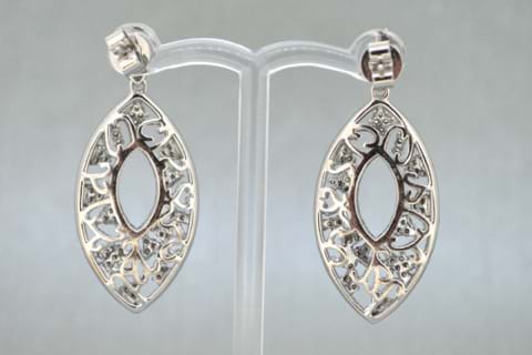 Intricately carved in 18ct white gold these stunning marquise shape drop earrings have been grain set with sparkling round brilliant cut diamonds to a total of 1.91cts. Independent Valuation Supplied