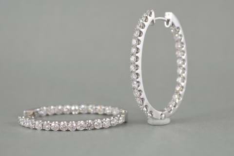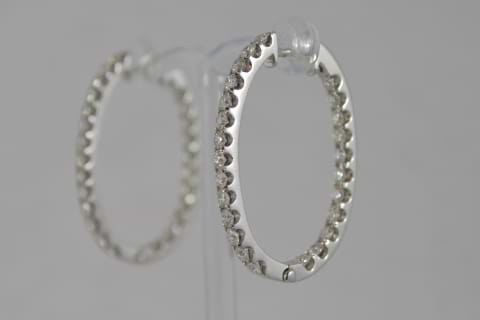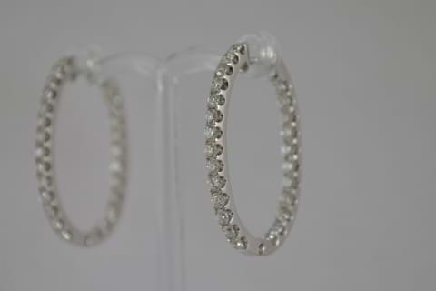 Impressive & striking 18ct white gold diamond hoops. Each hoop contains an amazing 25 round brilliant cut diamonds, cut down claw set down the front of the earring and down the inside edge of the back to give maximum sparkle factor! Total diamond content is 2.98cts. Independent Valuation Supplie