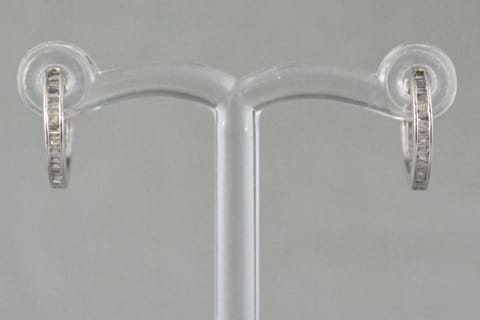 In 18ct white gold these simple and understated huggie style earrings contain baguette cut diamonds channel set with a total of 30 diamonds equalling 0.12cts.