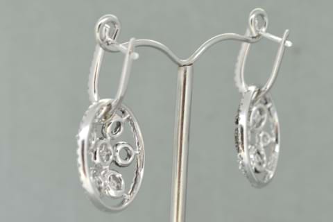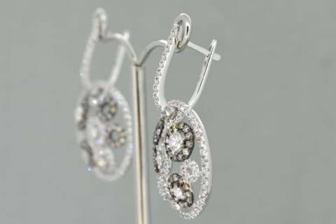 18ct White gold diamond huggie earrings with 12 round brilliant cut diamonds in each huggie with a removable drop feature white and champagne diamonds. The elegant and unusual circular design is both striking and sparkly and as a combined total these earrings contain 188 white round brilliant cut diamonds and 80 champagnes. Total white diamond content equals 1.89cts and total champagne diamond content equals 0.66cts. Independent Valuation Supplied