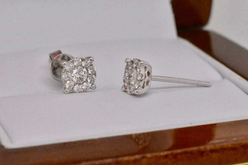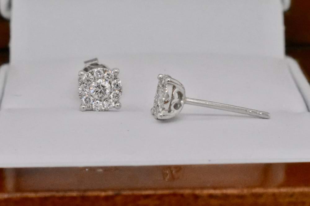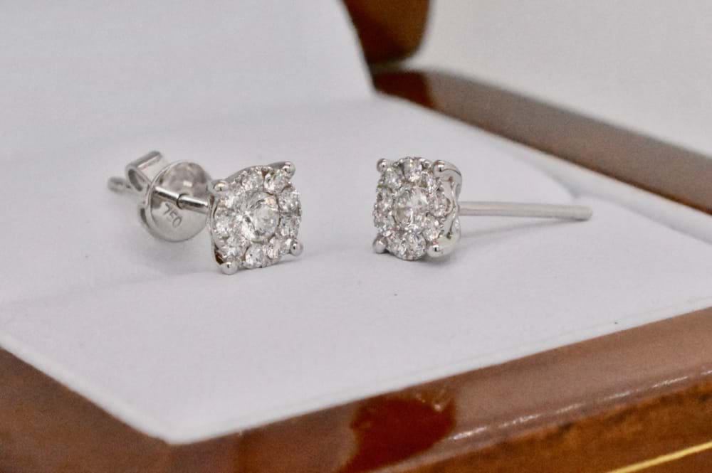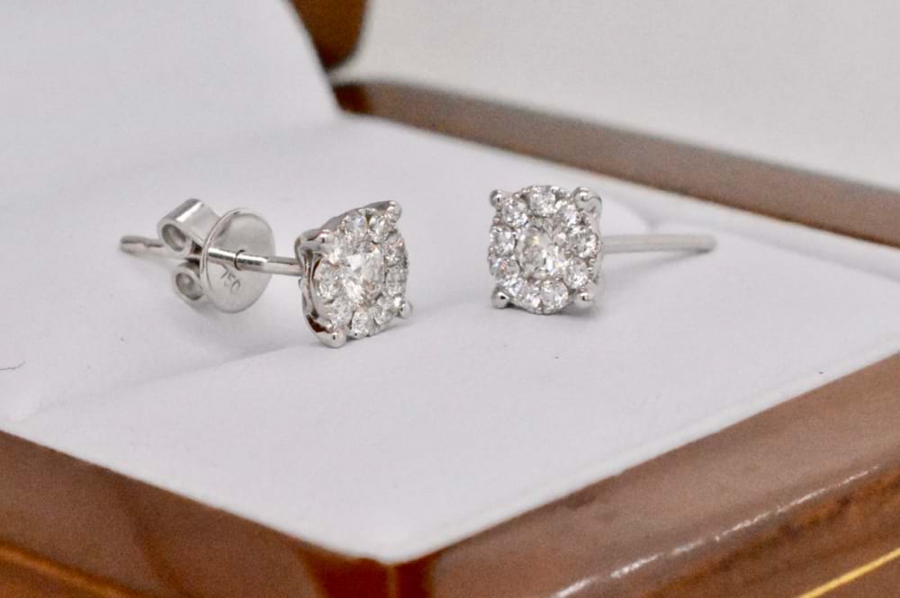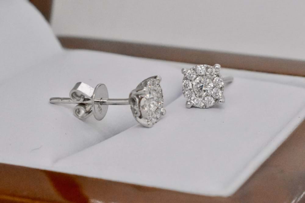 Set in 18ct white gold, these diamond illusion studs give the first impression of 2 = 1.40ct Diamonds at a fraction of the price because in reality each earring has one centre diamond and a carefully constructed halo of diamonds surrounding. There are a total of 20 diamonds equaling 0.34ct. Independent valuation supplied.