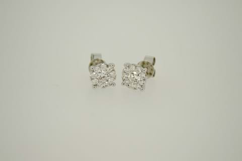 These cleverly designed diamond studs give the illusion of a much larger single stone diamond earring but are a combination of 20 shimmering round brilliant cut diamonds totalling 0.75cts in 18ct white gold. Independent Valuation Supplied