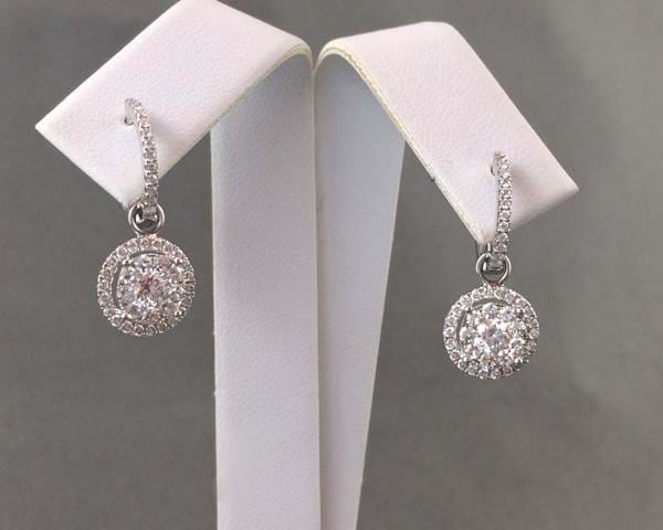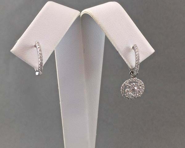 18ct white gold illusion set Diamond clusters with halo surrounds suspended from Diamond set huggies. Able to wear with or without drops, very versatile and a total of 1.25cts of Diamonds. Independent Valuation supplied.