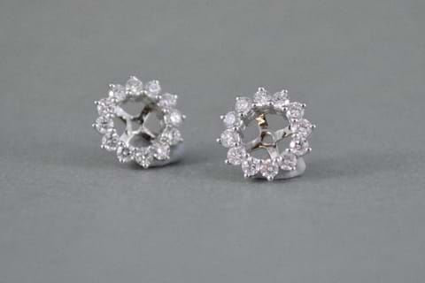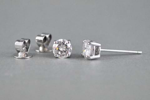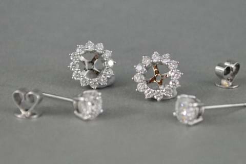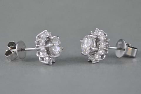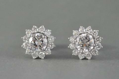 These absolutely impeccable (2=)1.07ct, E colour, VVS1 clarity, round brilliant cut diamonds are set into a simple 18ct white gold four claw stud setting. We are paired them with a beautiful set of removable daisy diamond surrounds which also feature high colour & clarity diamonds, allowing the wearer to dress up their already fabulous studs when going to a lunch or special event. The surrounds are also 18ct white gold and contain a total of 0.70cts of round brilliant cut diamonds. Independent Valuations Supplied. These pieces are also available for separate purchase