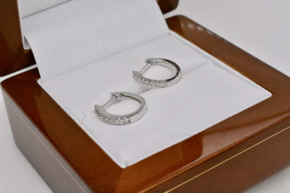 18ct white gold huggies each earring featuring nine, cut down claw set, round brilliant cut diamonds and a combined total diamond content of 0.18cts. Independent Valuation Supplied