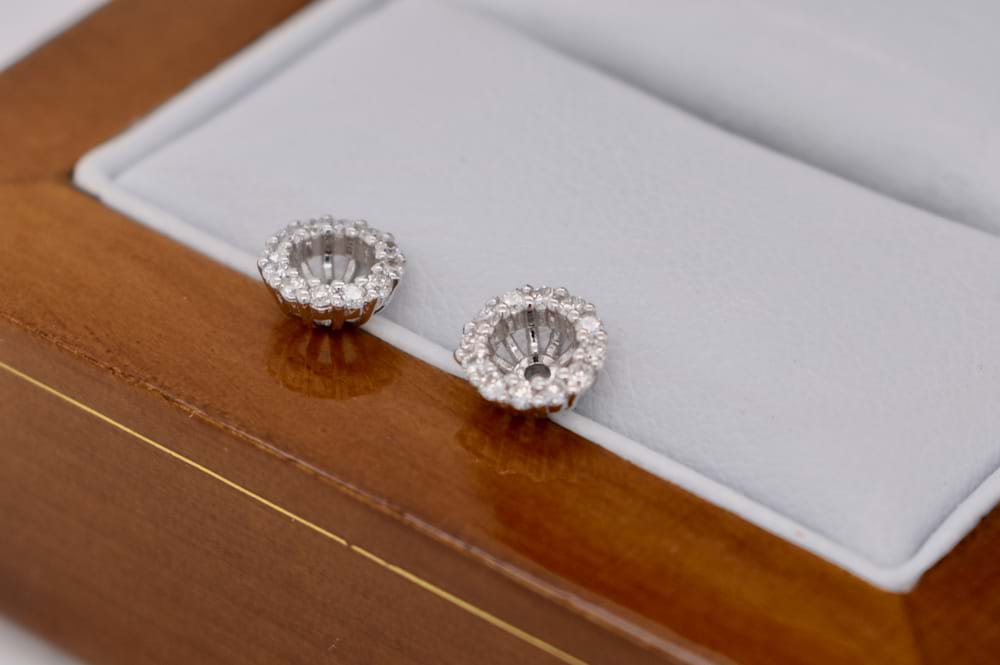 A versatile and stunning concept designed to dress up any pair of stud earrings (of the correct size center stone) these earrings jackets can be easily added or removed from your existing studs or come into the store to browse our selection of studs available. This pair of jackets are crafted in 18ct white gold and contain 24 round brilliant cut diamonds totaling 0.19cts in a round shape design and will hold 3mm studs-dependent on settings. Independent Valuation Supplied