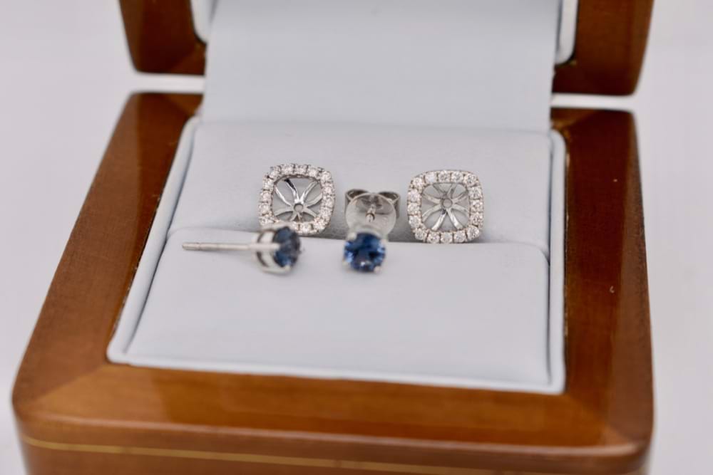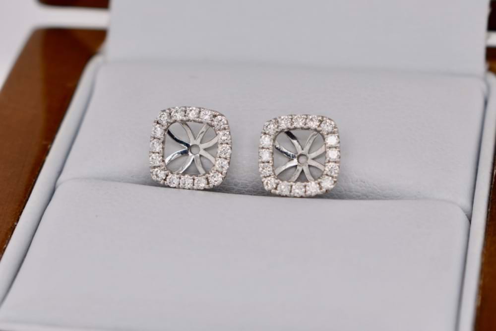 A versatile and stunning concept designed to dress up any pair of stud earrings (of the correct size centre stone) these earrings jackets can be easily added or removed from your existing studs or come into the store to browse our selection of studs available. This pair of jackets are crafted in 18ct white gold and contain 32 round brilliant cut diamonds totaling 0.32cts in a cushion shape design and will hold 4-5mm studs-dependent on settings. Independent Valuation Supplied
