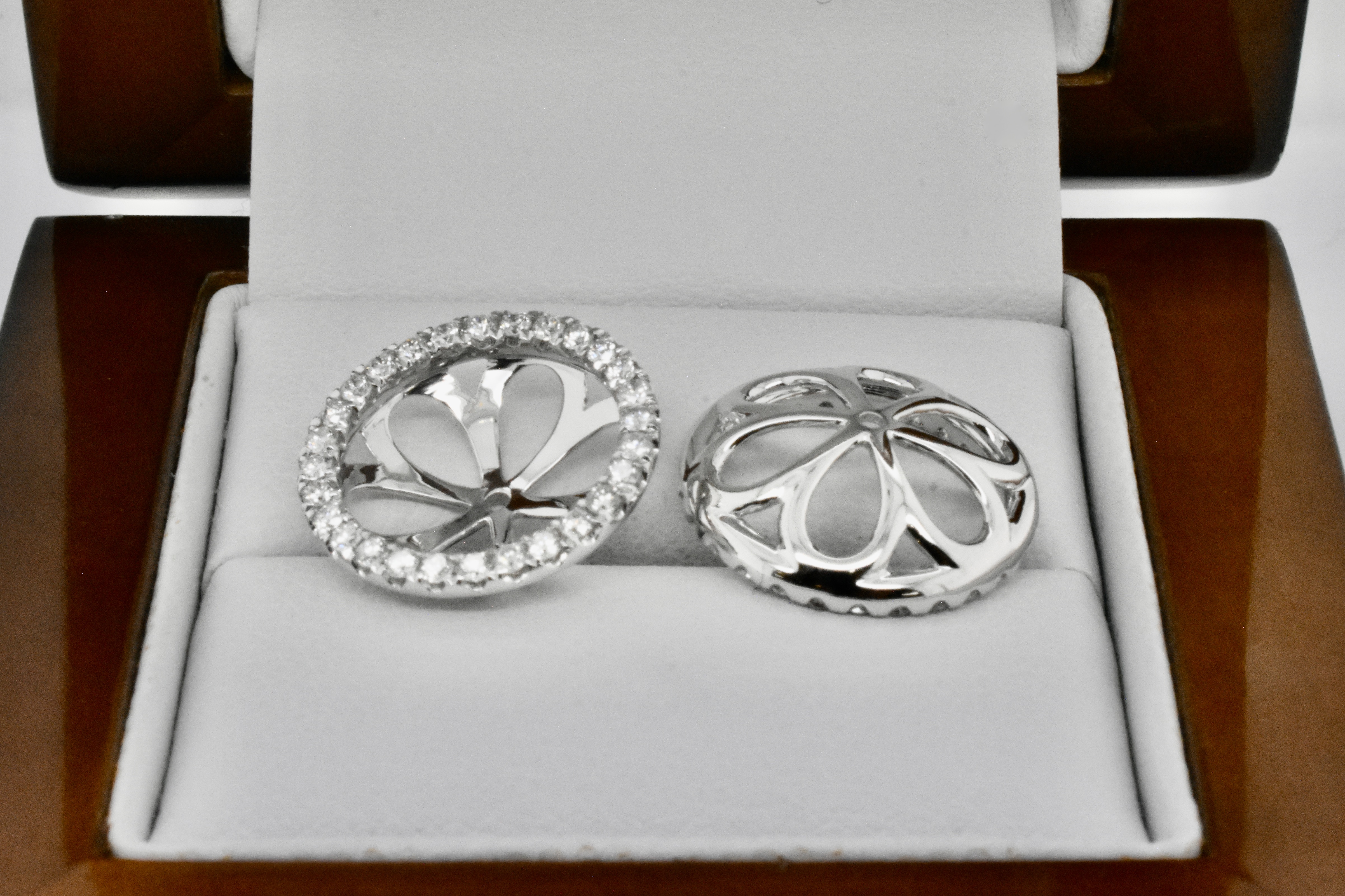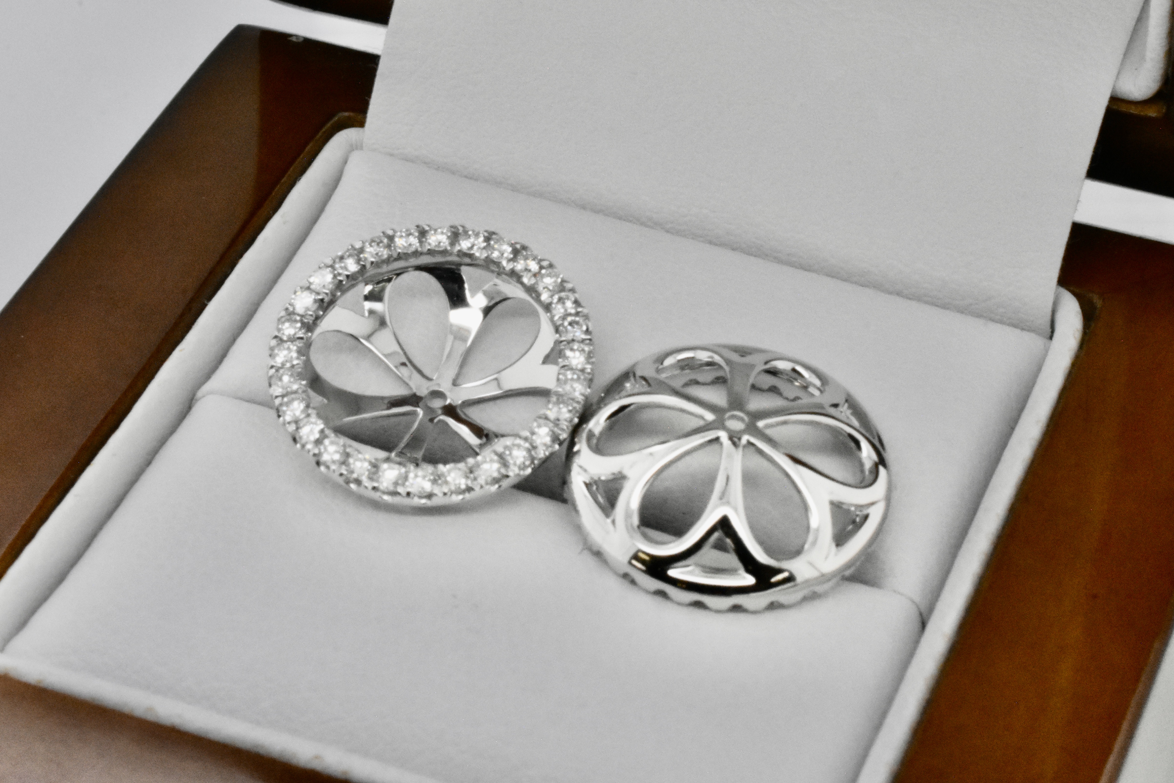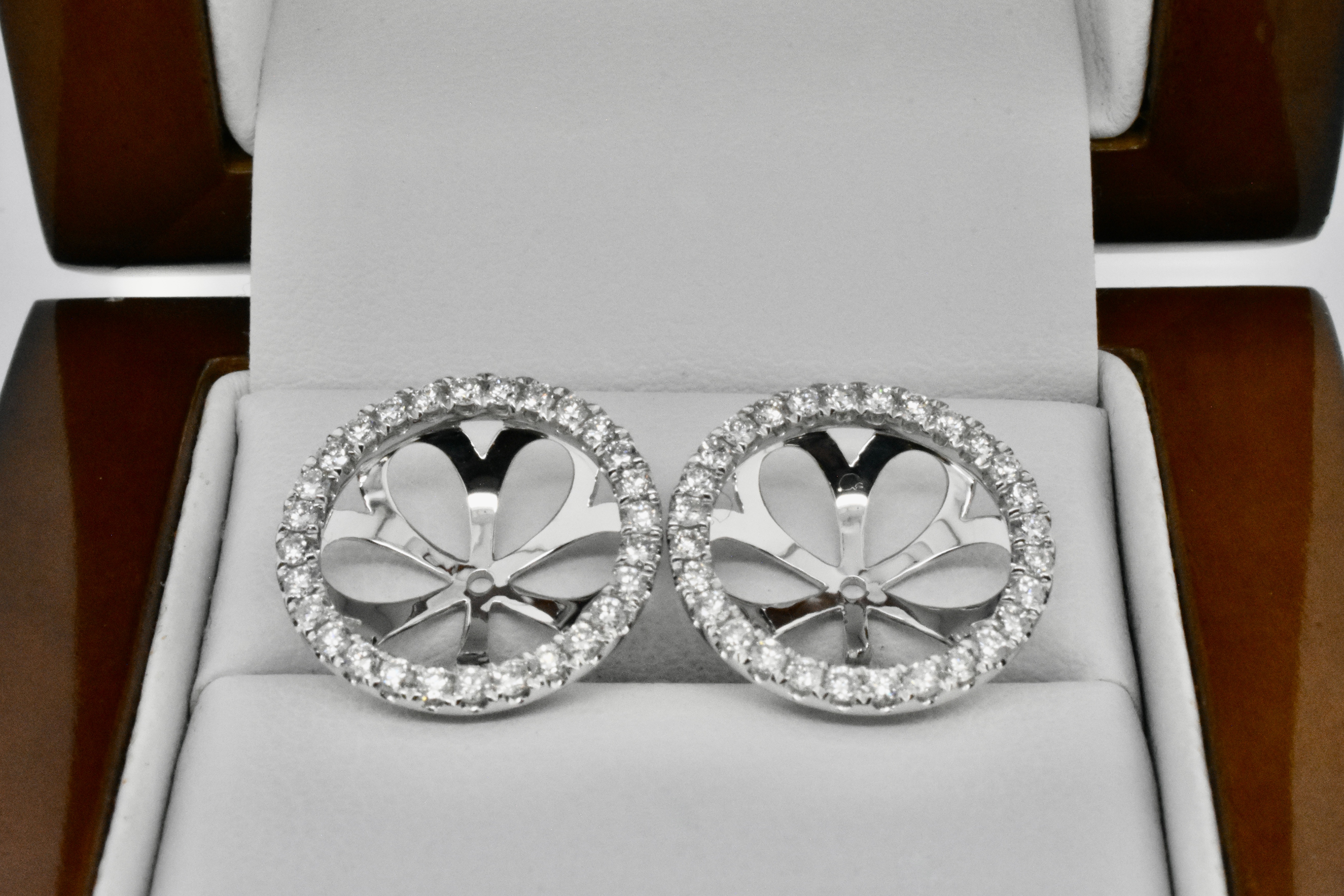 This large and versatile pair of earring jackets is crafted in 18ct white gold and set with a shimmering surround of white diamonds 56 = 0.74ct FG/VS. They are suitable for a 12mm centre piece whether that is pearls, diamonds or coloured gemstones, the perfect way to dress up your studs!