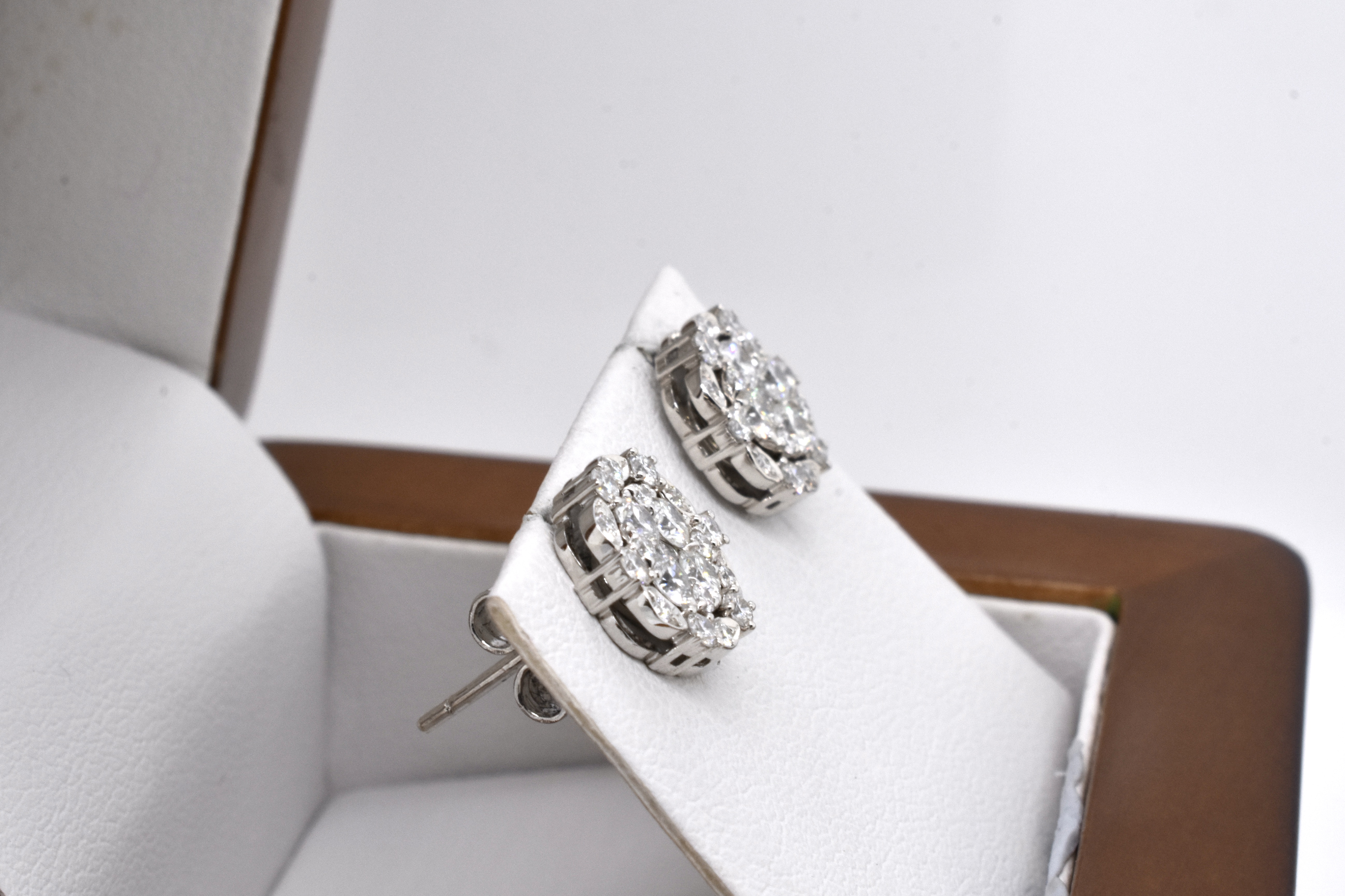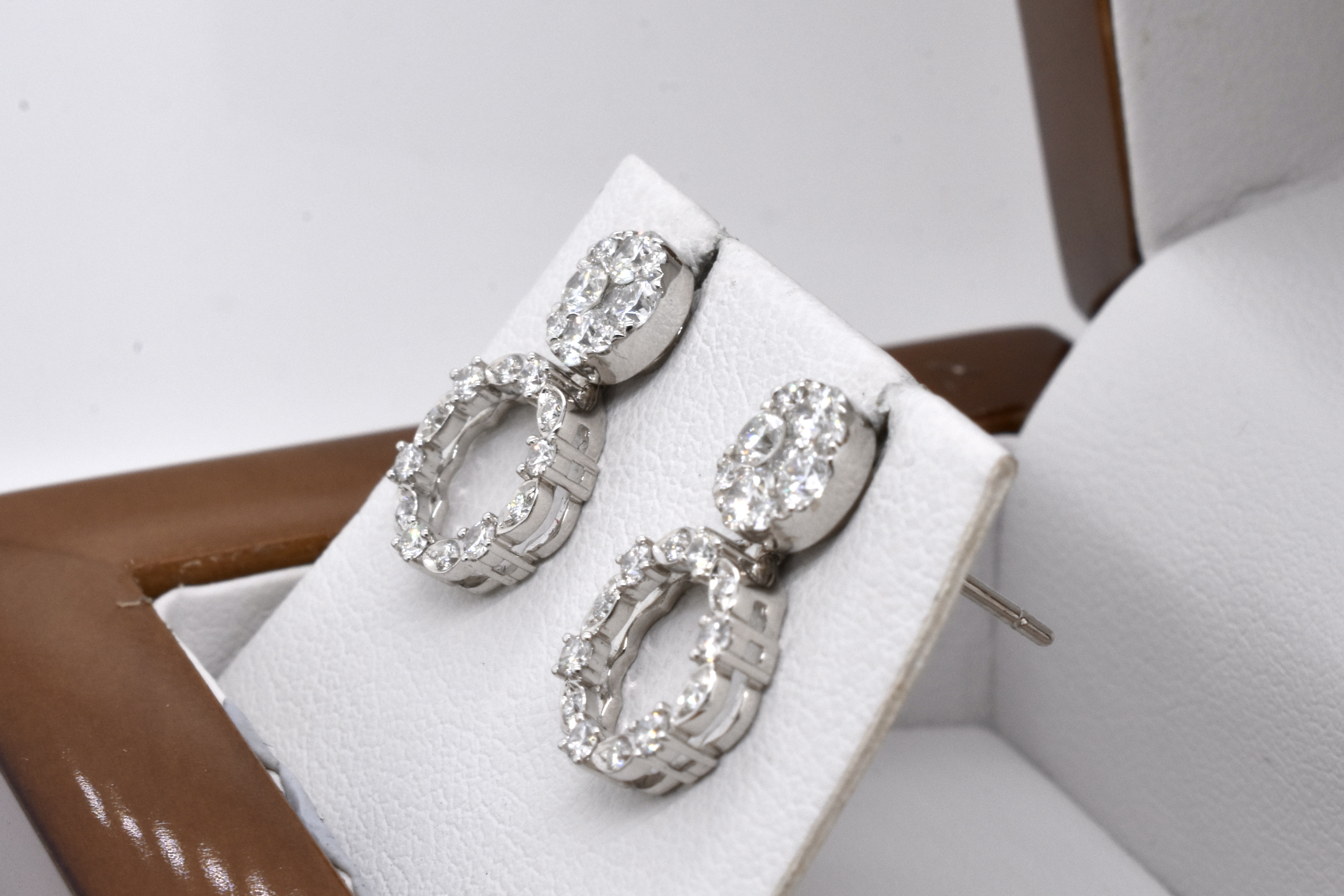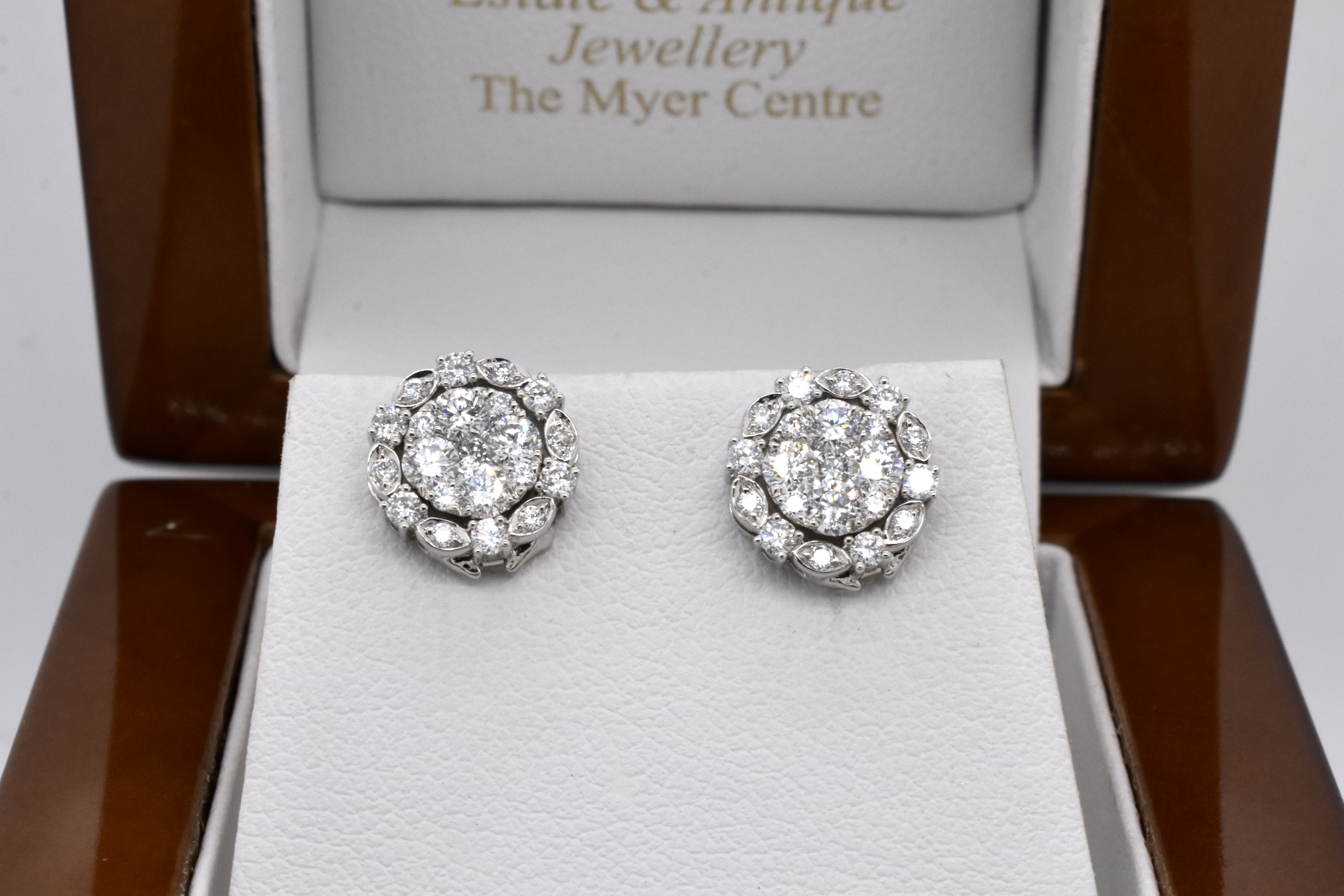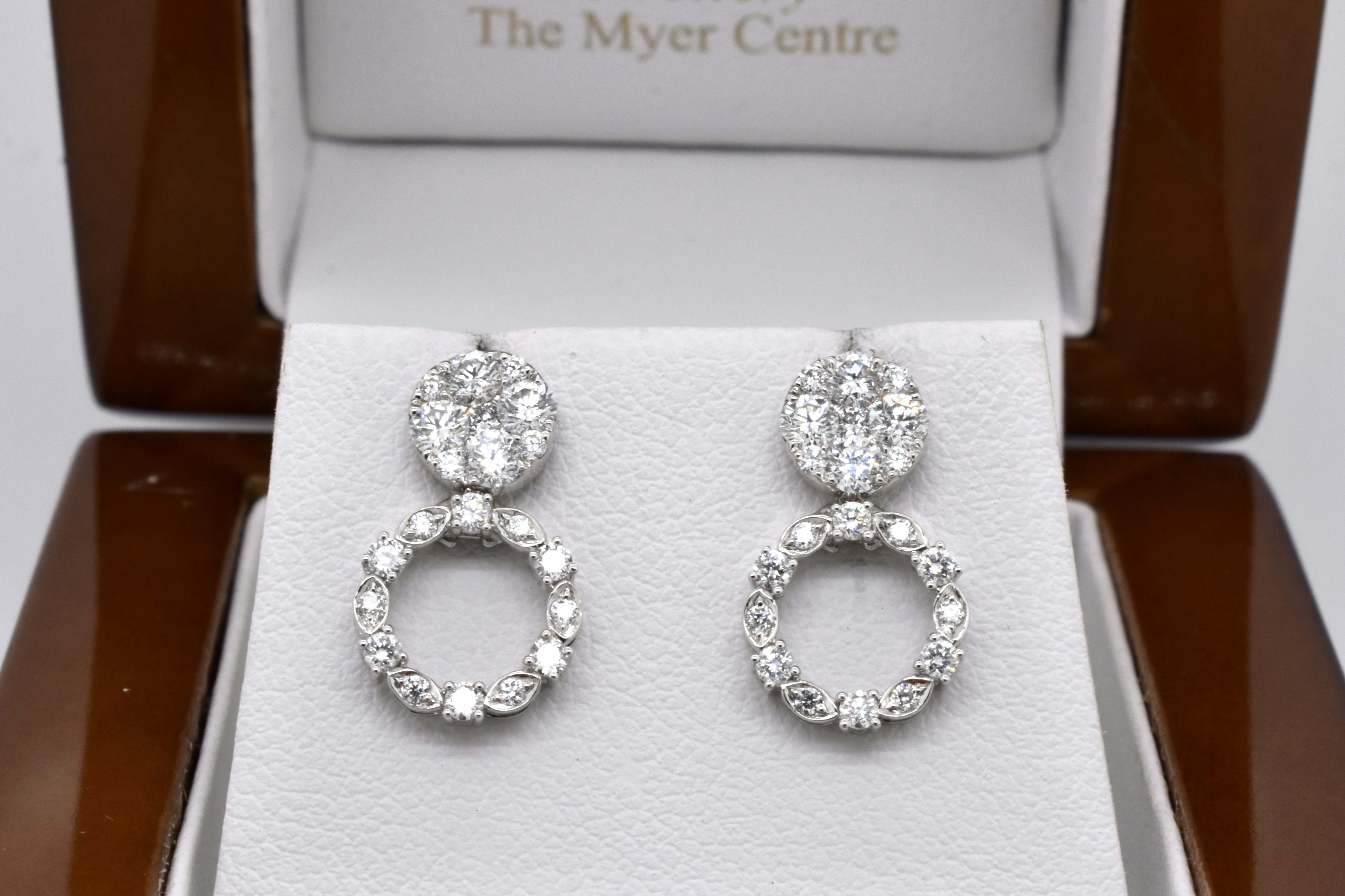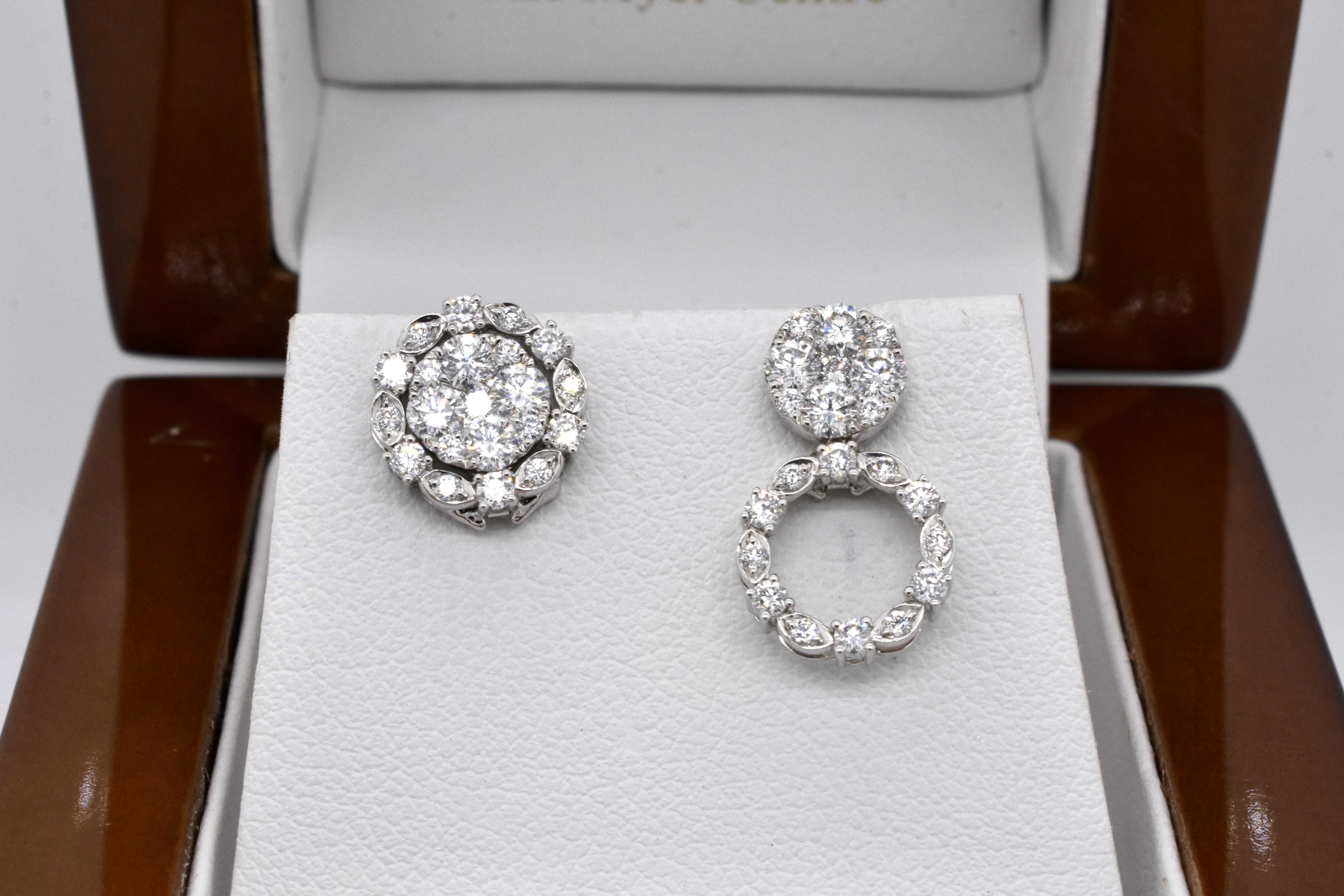 Quite possibly one of the most versatile designs, these cleverly engineered earrings are crafted from 18ct white gold and are set with a total of 42 bright and sparkly white diamonds equalling 0.91ct FG/VS-SI. These earrings can be worn in a multitude of ways, with the most basic version being a pair of studs. Add in the removable piece and they turn into a dressier pair of studs with jackets in a halo design. The most dressed up "evening wear" option is to unfold the jacket which will turn these into a pair of drop earrings, with the drop able to be worn to either the front of back of the earlobe