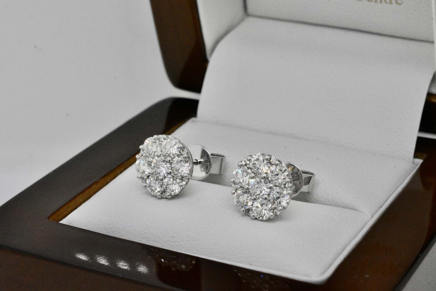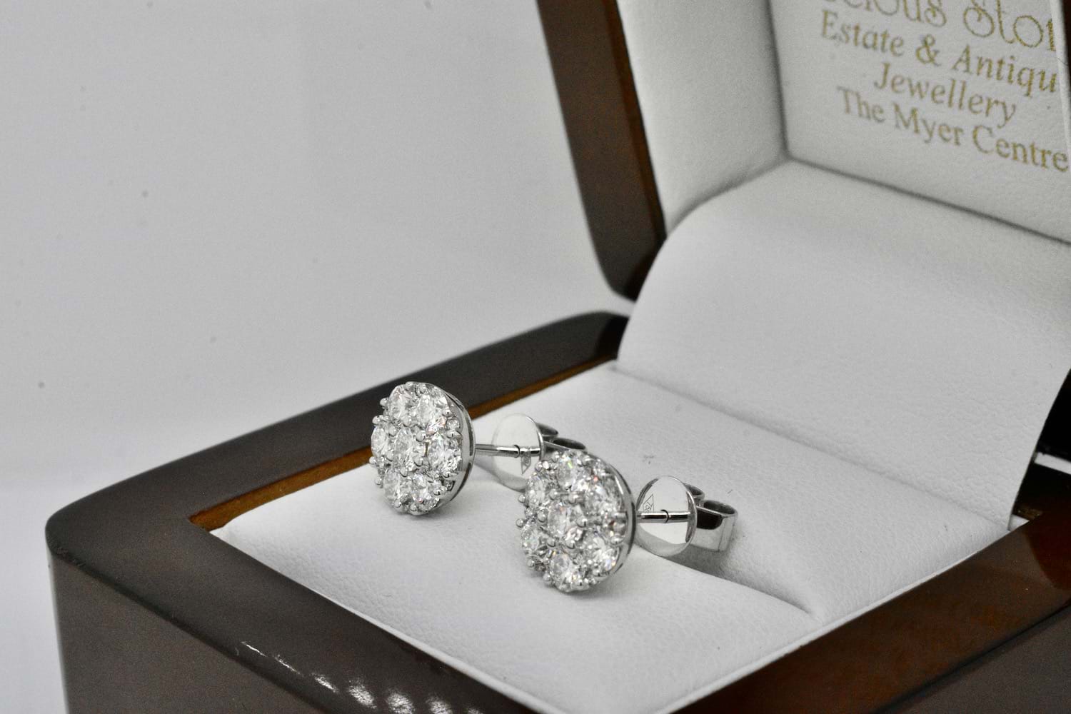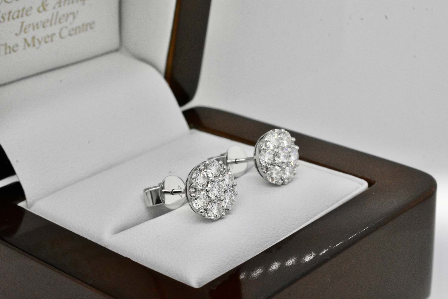 Stunning and sparkly 18ct white gold diamond stud earrings, each earring contains seven larger round brilliant cut diamonds with a six smaller diamonds set into the spaces around the outside creating a seamless diamond sparkle. The total diamond content equals 1.57cts FG/VS-SI. Independent Valuation Supplied.
