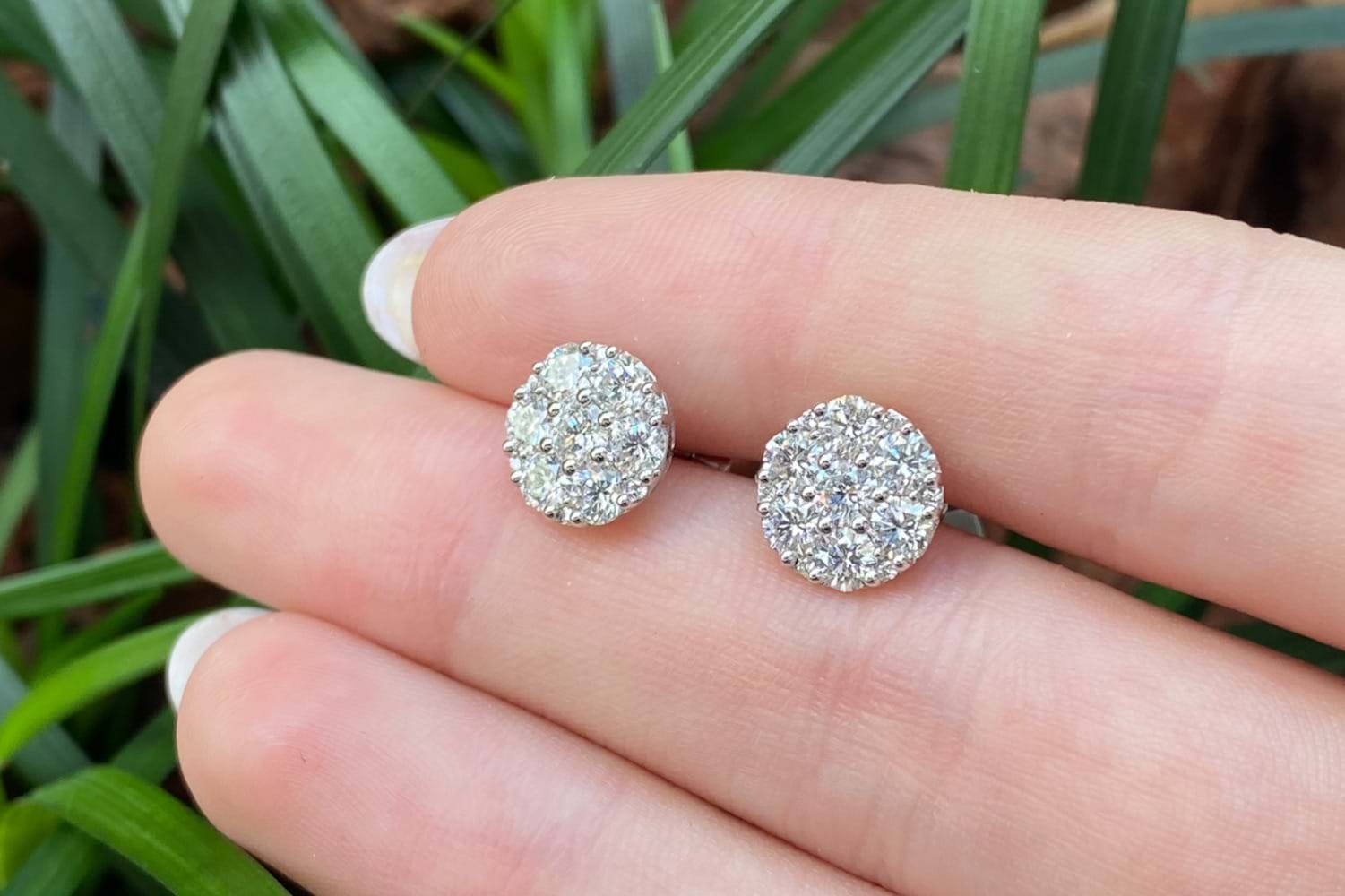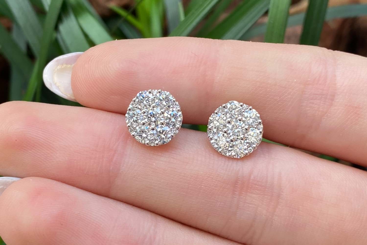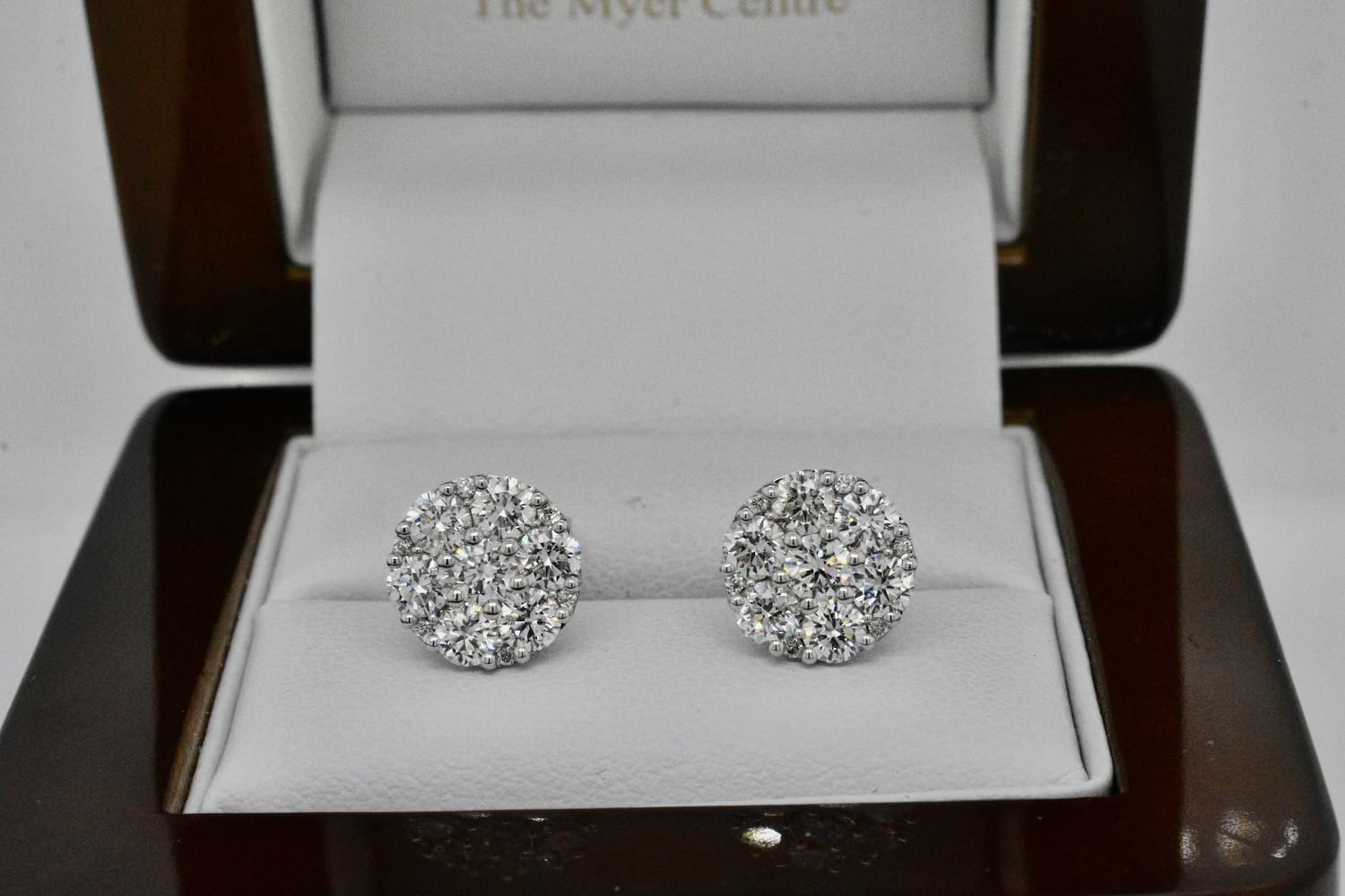 Stunning and sparkly 18ct white gold diamond stud earrings, each earring contains seven larger round brilliant cut diamonds with a six smaller diamonds set into the spaces around the outside creating a seamless diamond sparkle. The total diamond content equals 1.57cts FG/VS-SI. Independent Valuation Supplied.
