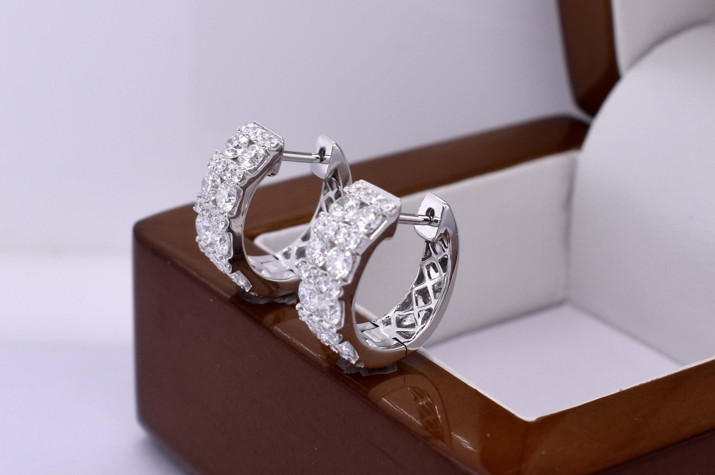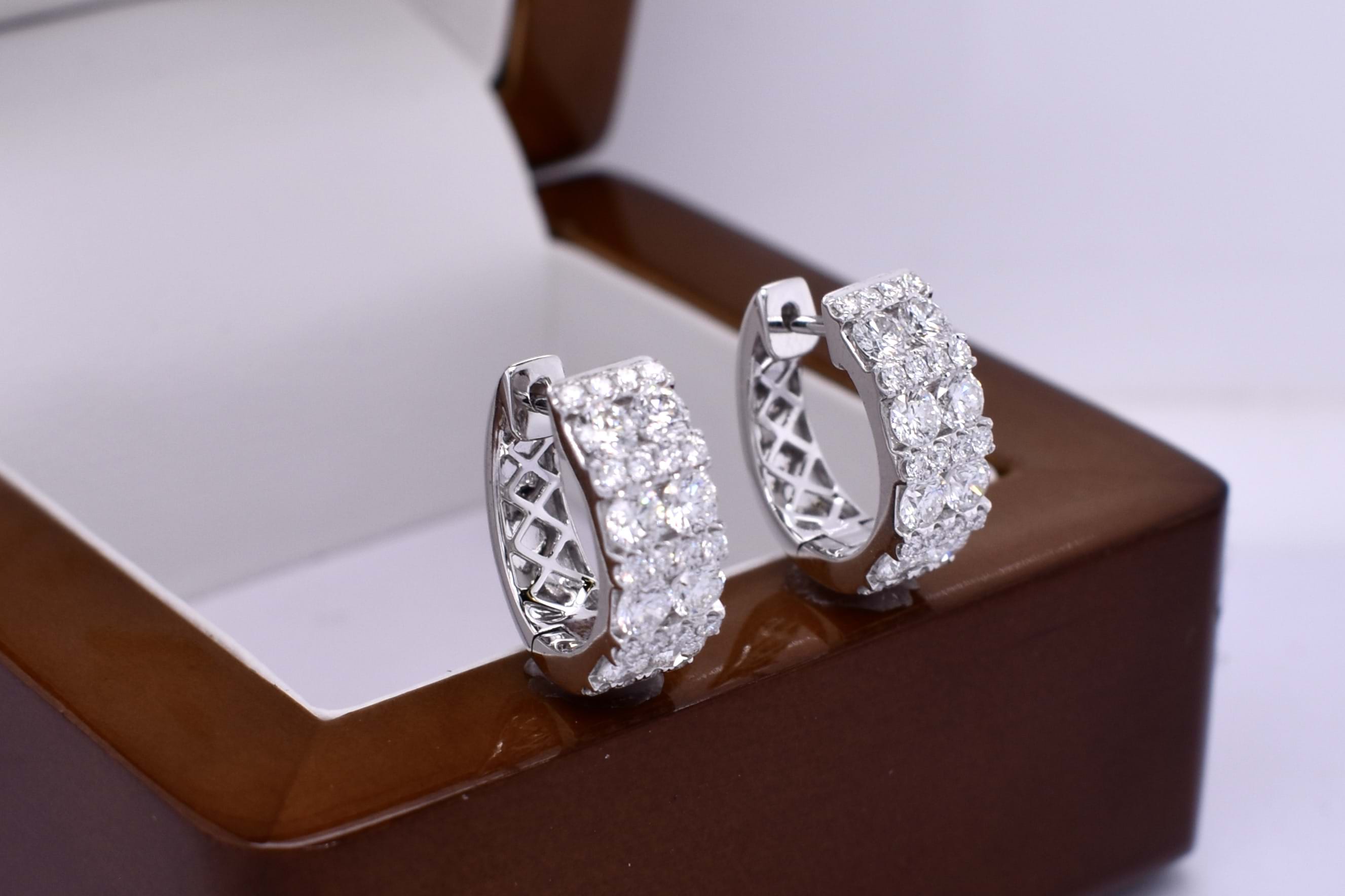 Sparkling four row diamond hoops set in 18ct white gold featuring 16 round brilliant cut 2.85mm diamonds channel set, equalling 1.38ct FG VS-SI, alternating with 40 round brilliant cut 1.30mm didamonds grain set, equalling 0.36ct. Total diamond weight of 1.74ct FG VS-SI. These 5.85mm wide front hinged hoops are completed with a clipped post fitting. 5.53 grams. Independent Valuation Supplied.