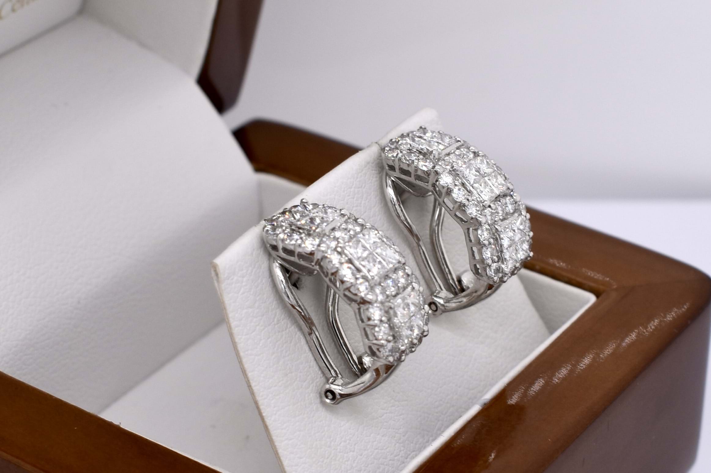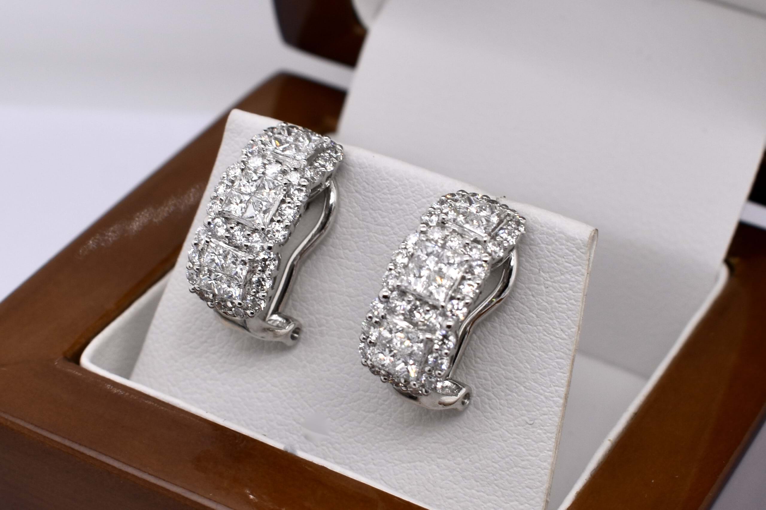 Striking and stunning 18ct white gold half hoop earrings with post & clip fittings. Each earring features three invisible set princess cut illusions with a shimmering round brilliant cut halo surrounding each illusion. The princess cut illusions total 0.96cts and the 60 round brilliant cut diamonds total 1.44cts FGVS-SI. Independent Valuation Supplied