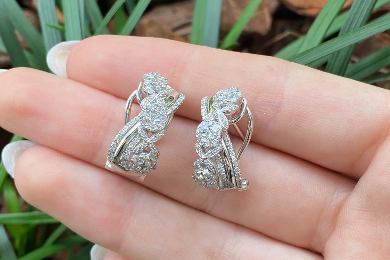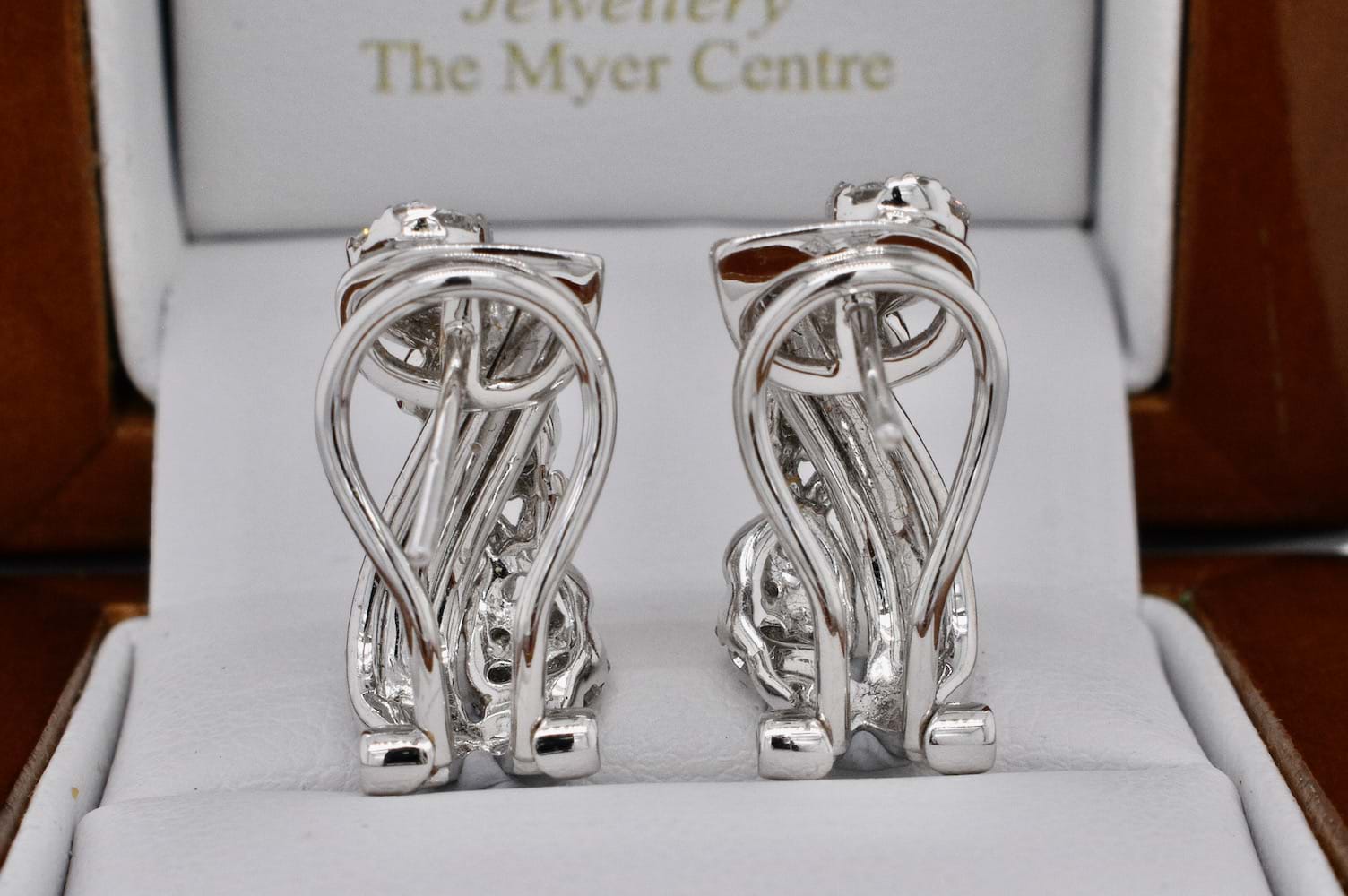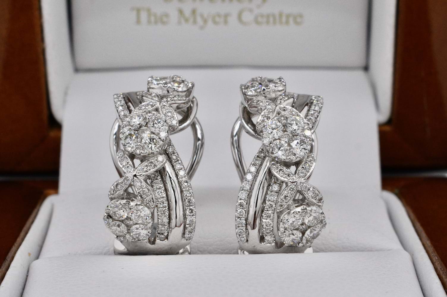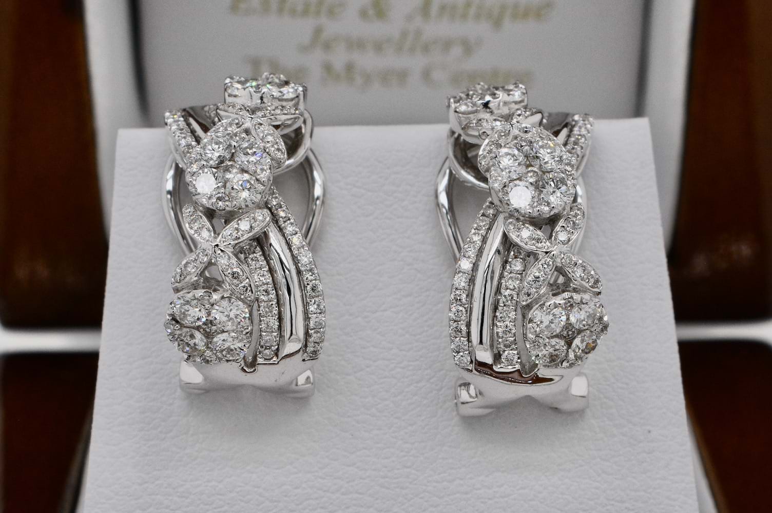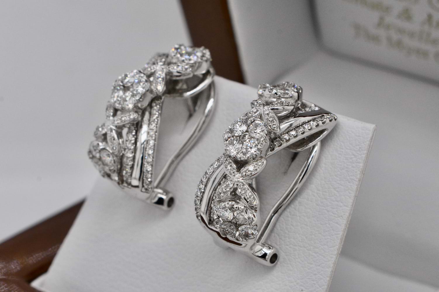 These gorgeous 18ct white gold ear clips have a very high jewellery feel with their clusters of shimmering round brilliant cut diamonds in marquise shape settings in a design reminiscent of butterflies with sweeping rows of diamond and polished white gold bars set underneath. The earrings contain a total of 1.56cts GVS and have post and clip fittings. Independent Valuation Supplied