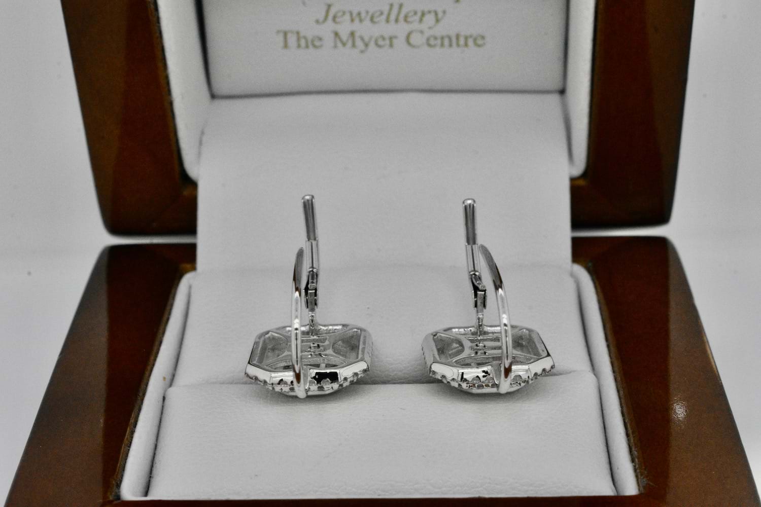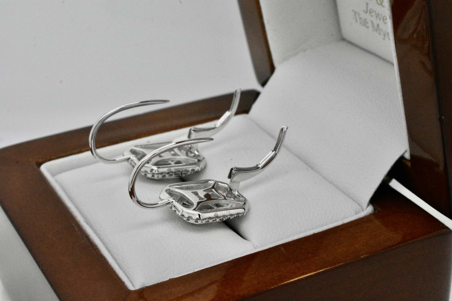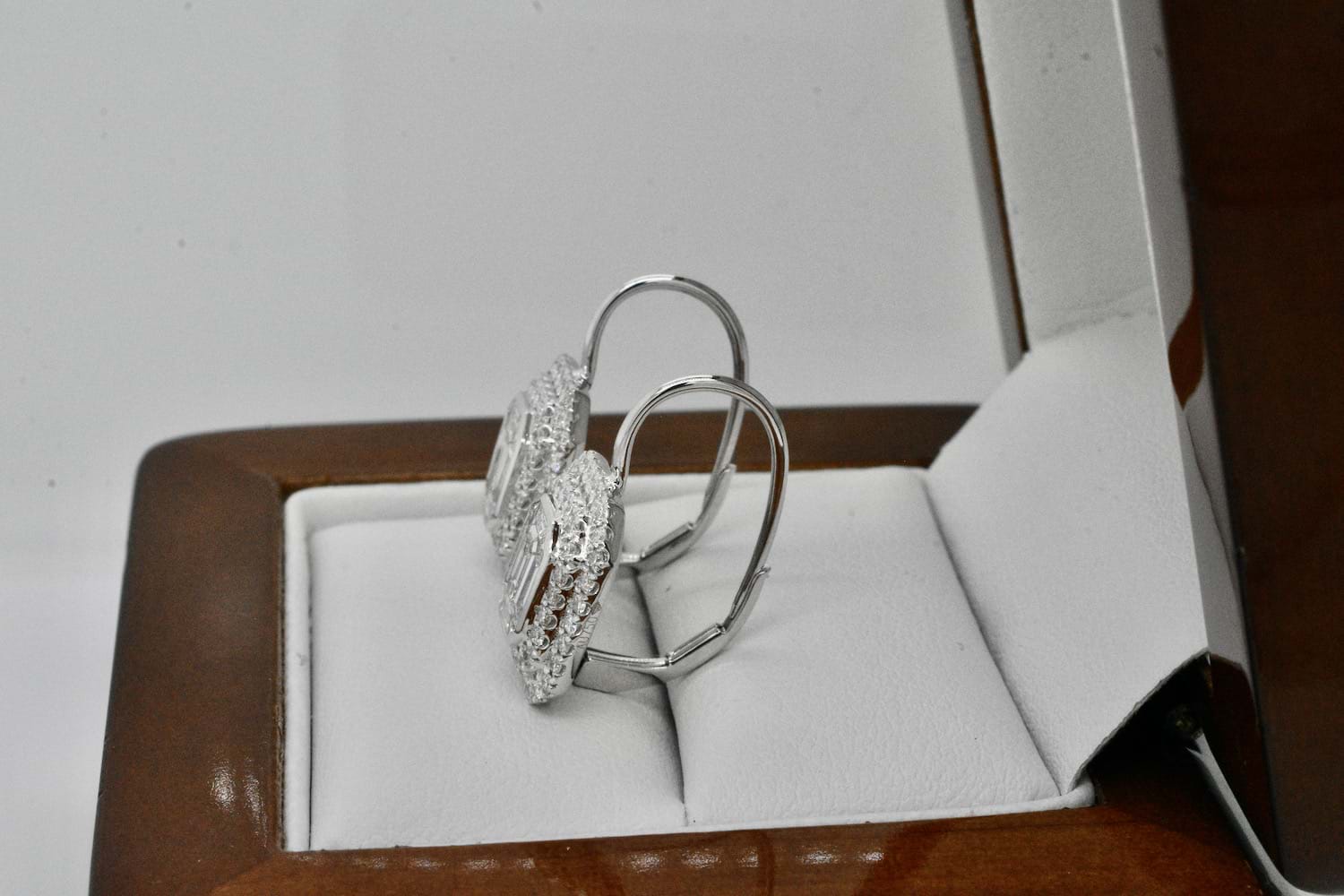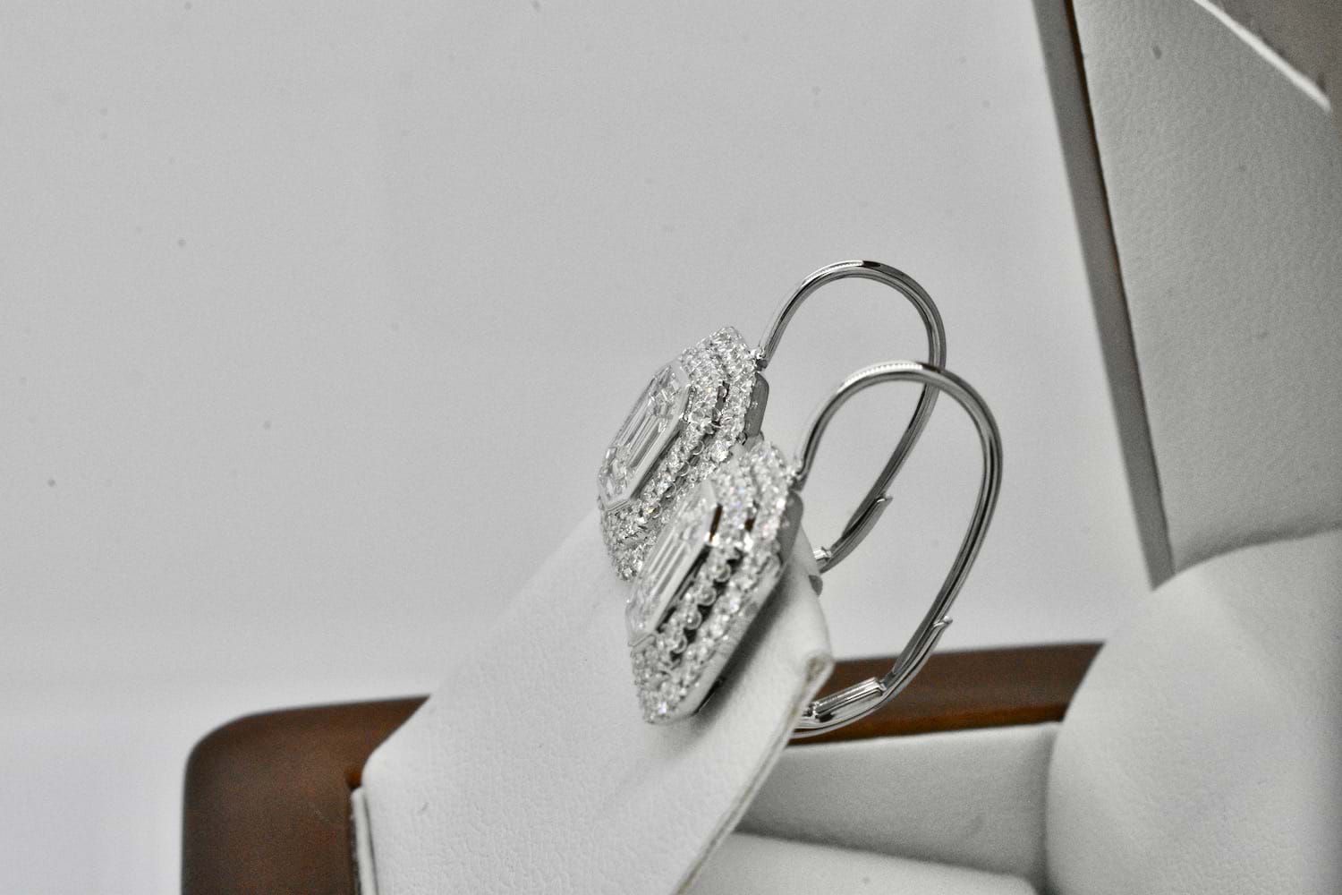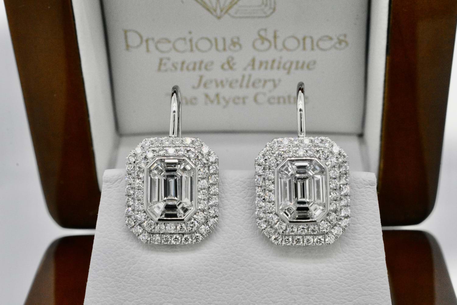 Spectacular and scintillating!! These stunning 18ct white gold drop earrings feature an emerald cut diamond in the centre surrounded by 8 tapered baguettes invisibly set with a double halo of shimmering, high white, round brilliant cut diamonds with hinged hook style fittings. Total diamond content equals 1.49cts G colour VS clarity. Independent Valuation Supplied