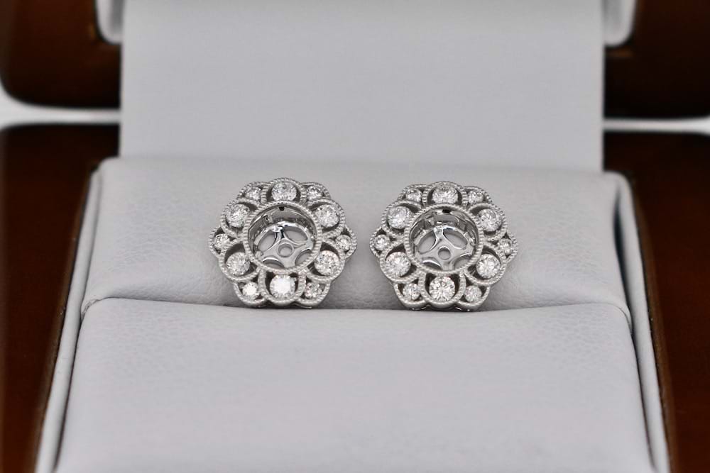 This pair of jackets are crafted in 18ct white gold and contain 24 round brilliant cut diamonds totaling 0.43cts (FG/VS) in a fancy Art Deco design and will hold 4-4.5mm studs-dependent on settings. Independent Valuation Supplied.