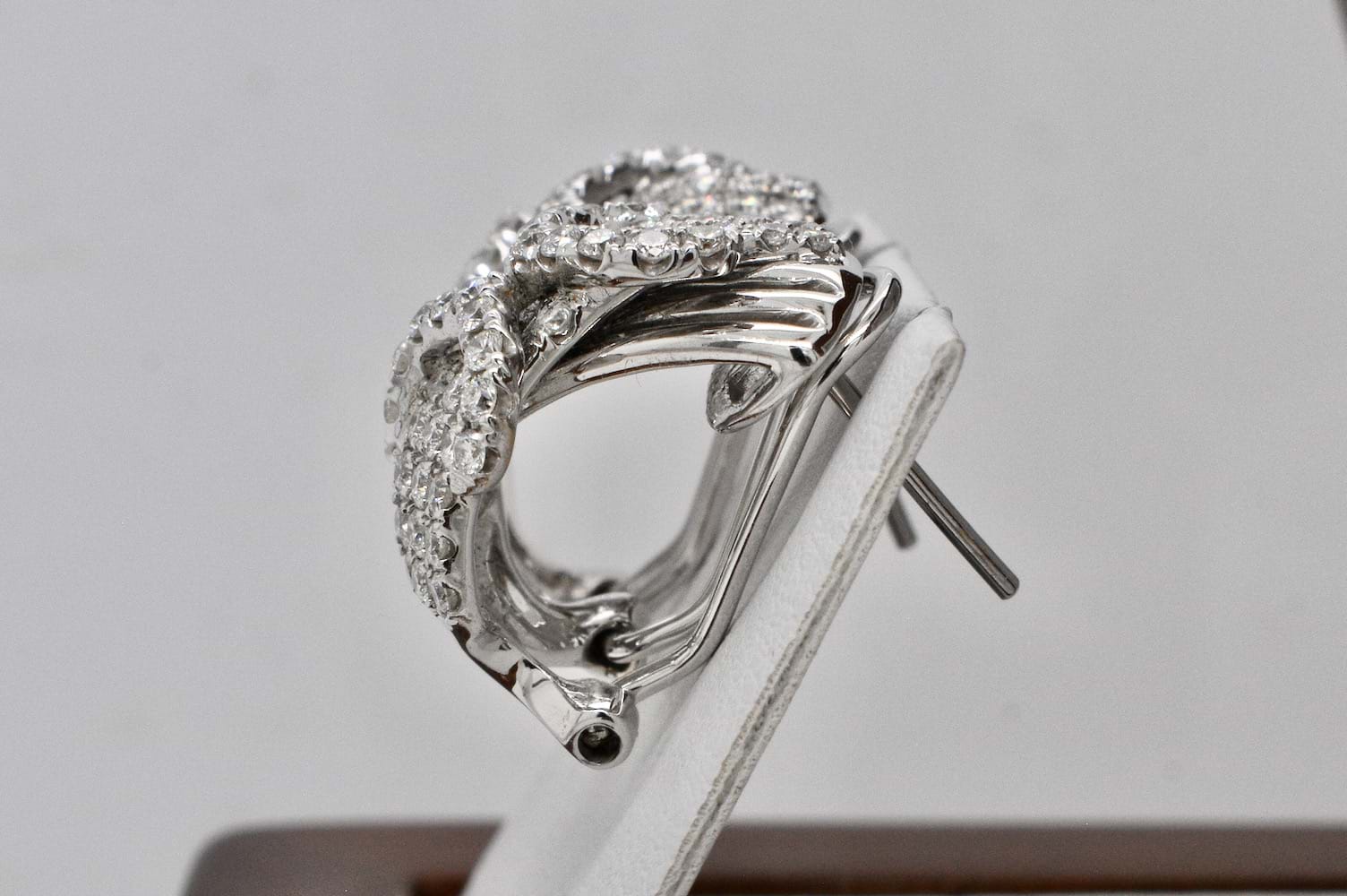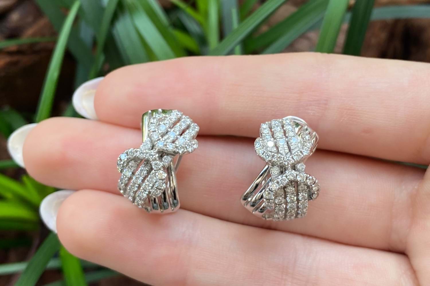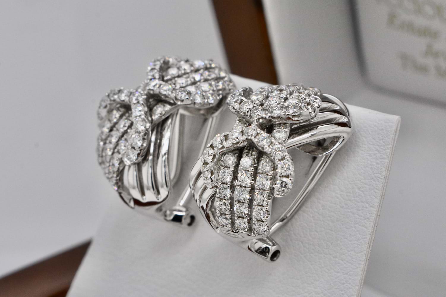 A classic and striking design crafted in 18ct white gold featuring 94 sparkling round brilliant cut diamonds cut down claw set in a knot/swirl design with post and clip fittings. Total diamond content equals 1.27cts GVS-SI. Independent Valuation Supplied