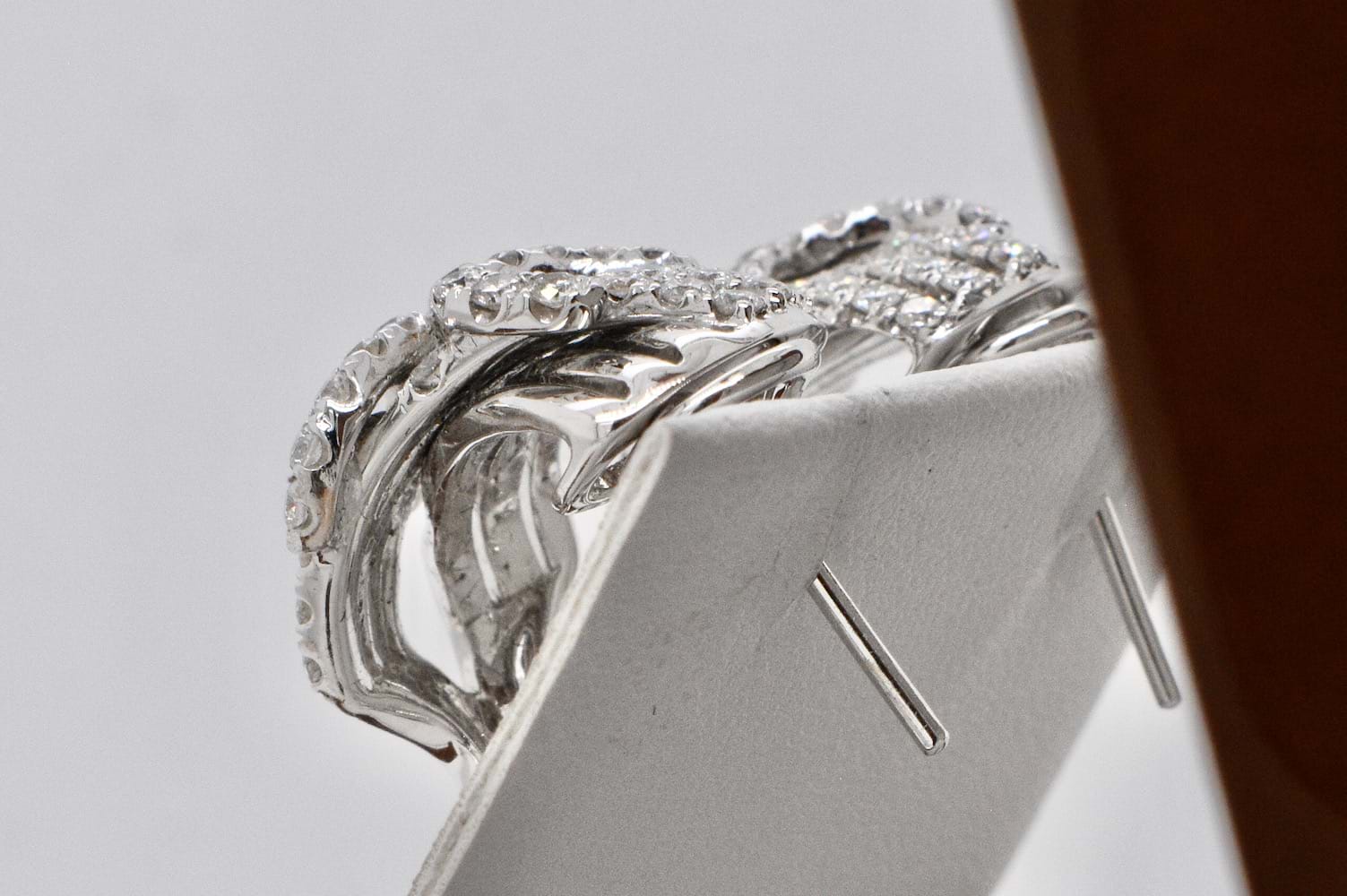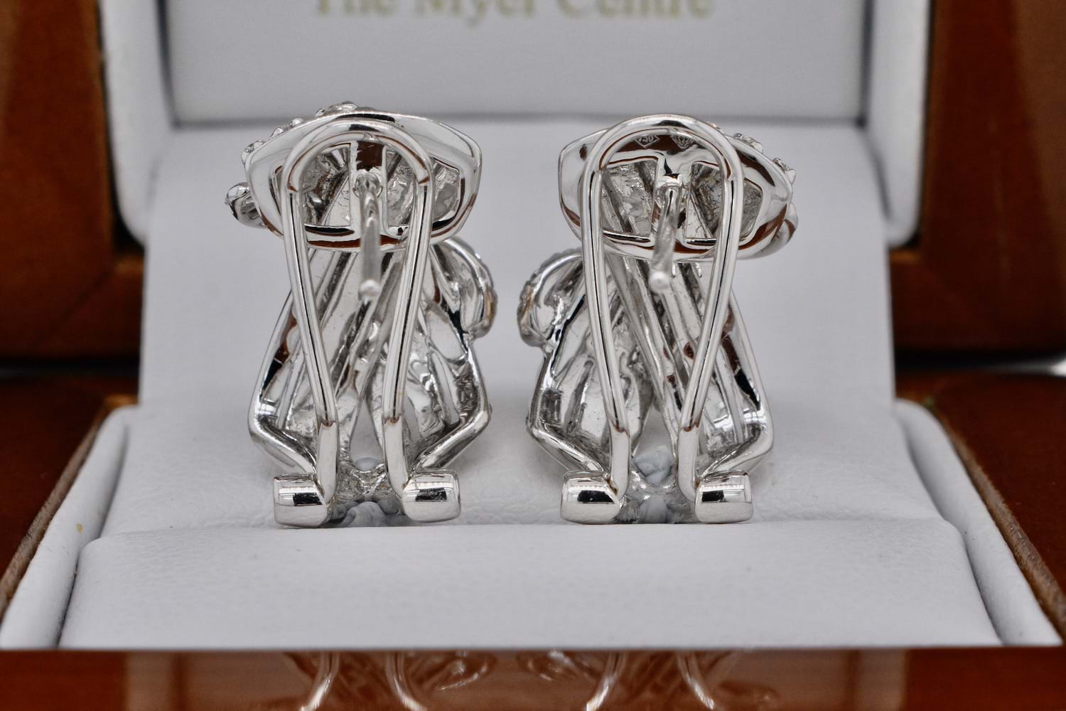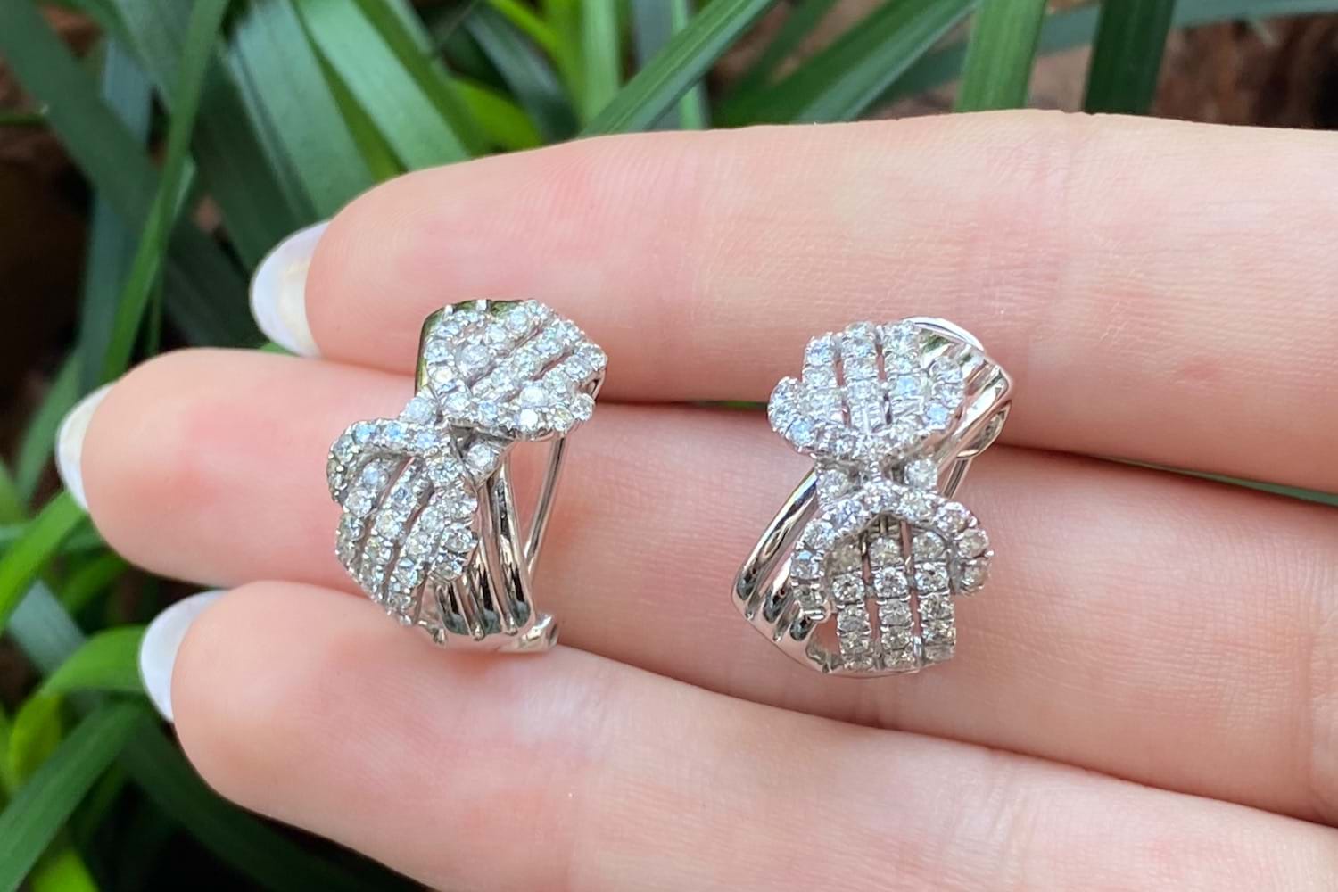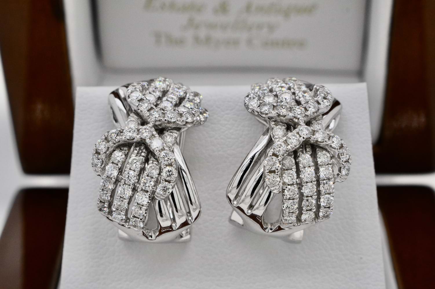 A classic and striking design crafted in 18ct white gold featuring 94 sparkling round brilliant cut diamonds cut down claw set in a knot/swirl design with post and clip fittings. Total diamond content equals 1.27cts GVS-SI. Independent Valuation Supplied