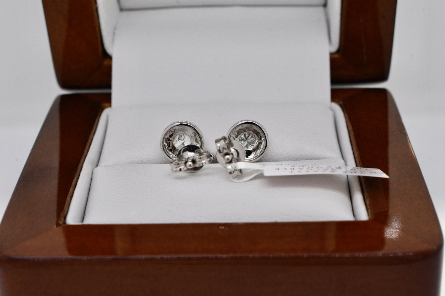 This pretty pair of 18ct white and rose gold stud earrings feature a central shimmering round brilliant cut white diamond with a halo of certified Argyle pink diamonds in a grain set single row and an accent of two channel set white diamonds at the top. The earrings contain a total of 34 pink diamonds equalling 0.14cts (Argyle lot number provided) LP-NCP/SI-P2 & six white diamonds equalling 0.17cts FG/VS-SI. Independent Valuation Supplied