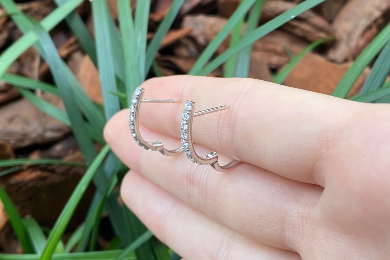 Our signature diamond huggies crafted in 18ct white gold in a flattering and elegant U shape design with each earring containing nine round brilliant cut diamonds cut down claw set and a combined total of 0.41cts (FG/VS). These earrings are stunning on their own or paired with our pearl or gem set earring enhancers. Independent Valuation Supplied
