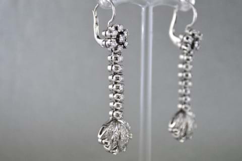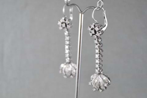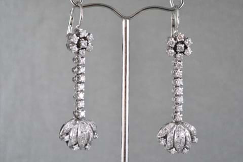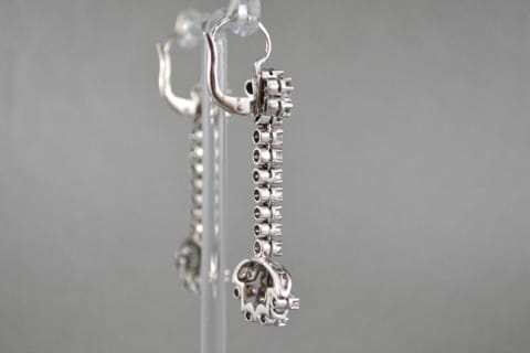 These striking vintage drop earrings have been crafted in 18ct white gold and feature 50 shimmering single cut diamonds with a total combined weight of 0.60cts. With a beautiful fan design fetature at the bottom of the drop and a cluster of diamonds at the top these are truly a statement piece. Independent Valuation Supplied