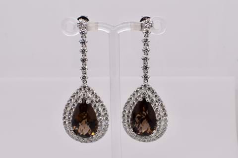 Set in 18ct white gold are these stunning 2 = 14.13ct Smokey Quartz drop earrings encrusted with 4.81ct of beautiful, sparkling diamonds. Independent Valuation Supplied