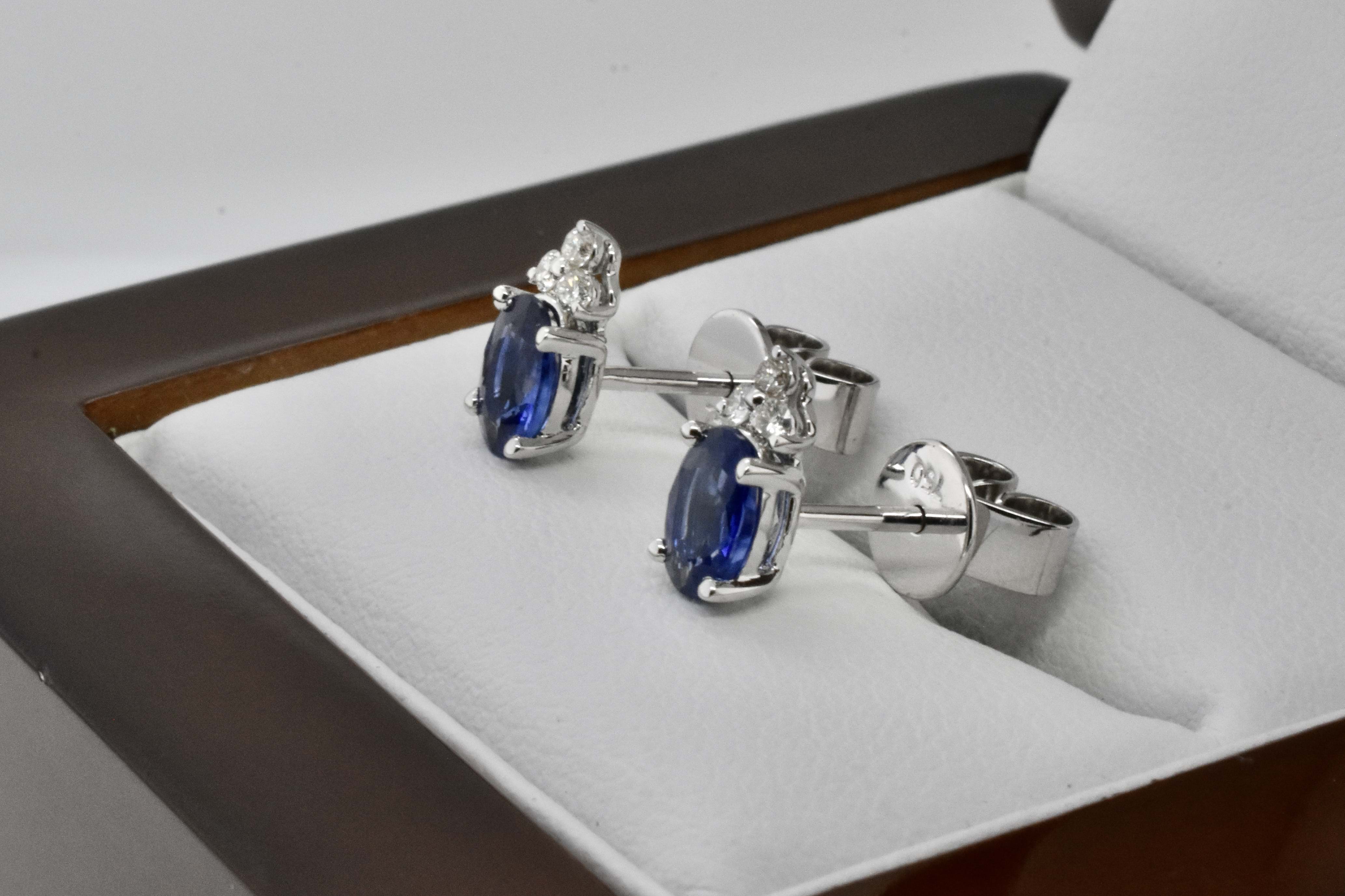 This dainty pair of 18ct white gold studs feature stunning oval Ceylon sapphires equalling 0.94ct and set with three sparkling IJ/SI RBC diamonds on top in an elegant point design with post and butterfly fittings. Total diamond weight is 6 equalling 0.09ct. Independent Valuation Supplied