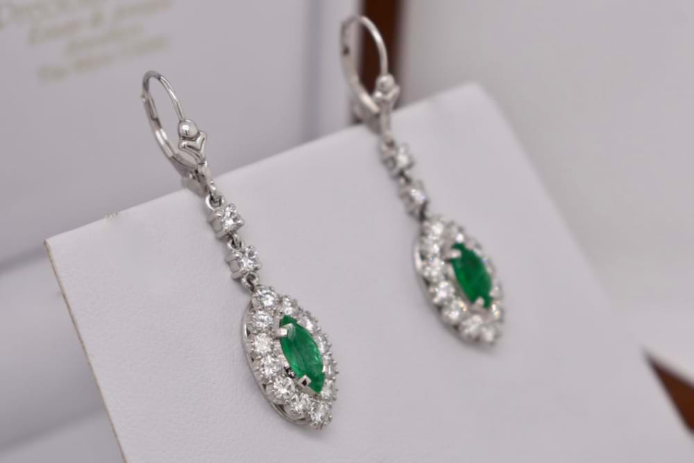 These classic vintage Emerald drop earrings are set in 9ct white gold with the leaf style Euro hook in 18ct white gold. The two beautiful natural mid green Emeralds are marquise cut and total 1.0ct, surrounded by Diamonds and suspended by two Diamonds at the top. 28 total Diamonds equalling 1.40ct