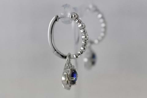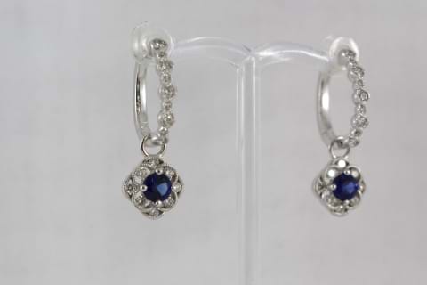 Exceptional Ceylon blue sapphires set into decorative diamond surrounds in a very 1920's inspired style, suspended from similar style diamond huggies with the option to wear the huggies with or without the drops. The two sapphires total 0.96cts and total combined diamond weight equals 0.81cts. Independent Valuations Supplied. Available for separate purchase on request